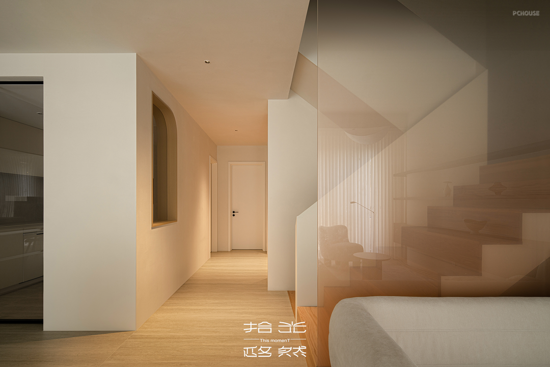 木质楼梯带着温吞的呼吸感,一阶一阶往家深处钻,路过时,沙发上的慵懒会漫过来,楼梯转角的小夜灯忽明忽暗,生活的「层次感」,就这么从虚实缝隙里溢出来 ——