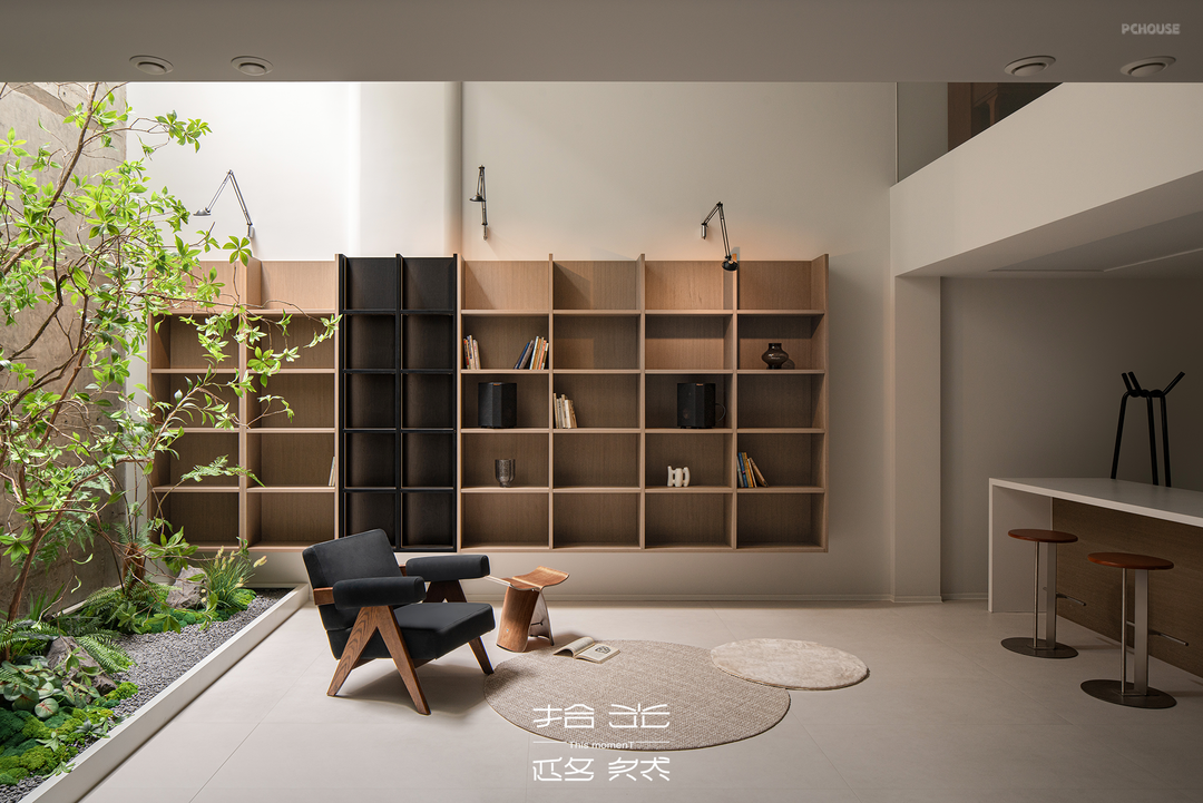 地下室自带的清水混凝土故意留着粗糙的疤,倒成了绿植最好的舞台。几株树顺着天井疯长,把阳光撕成碎金,落在书架和藤椅上。