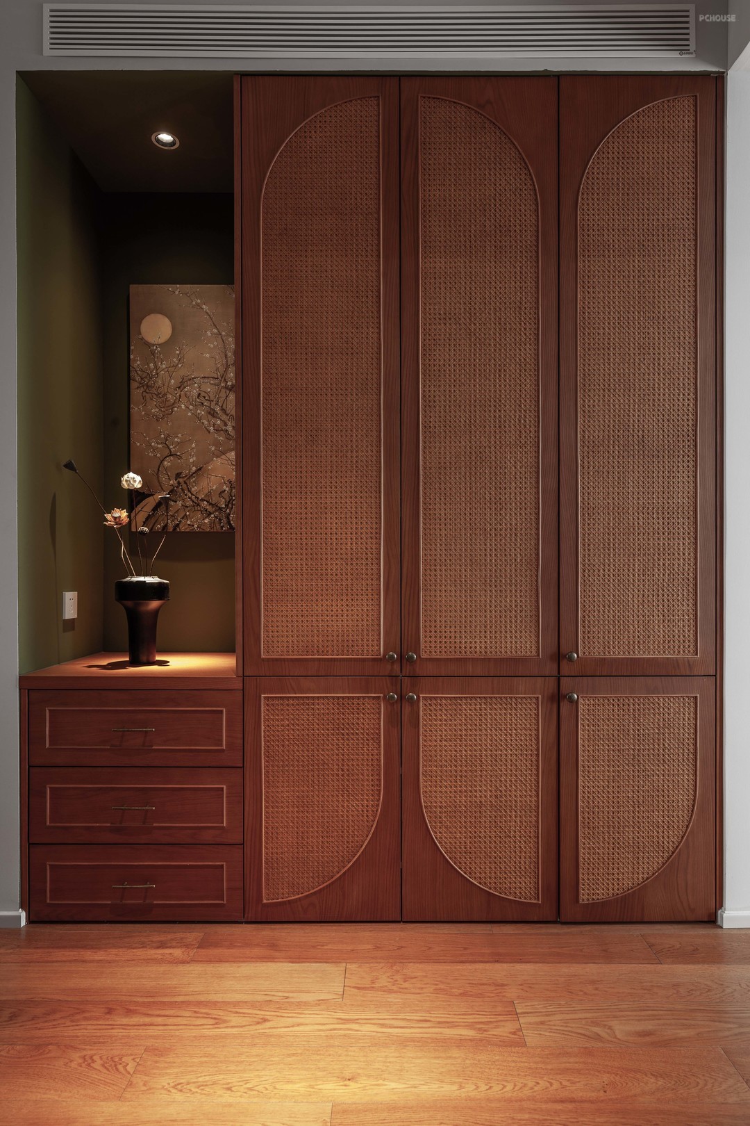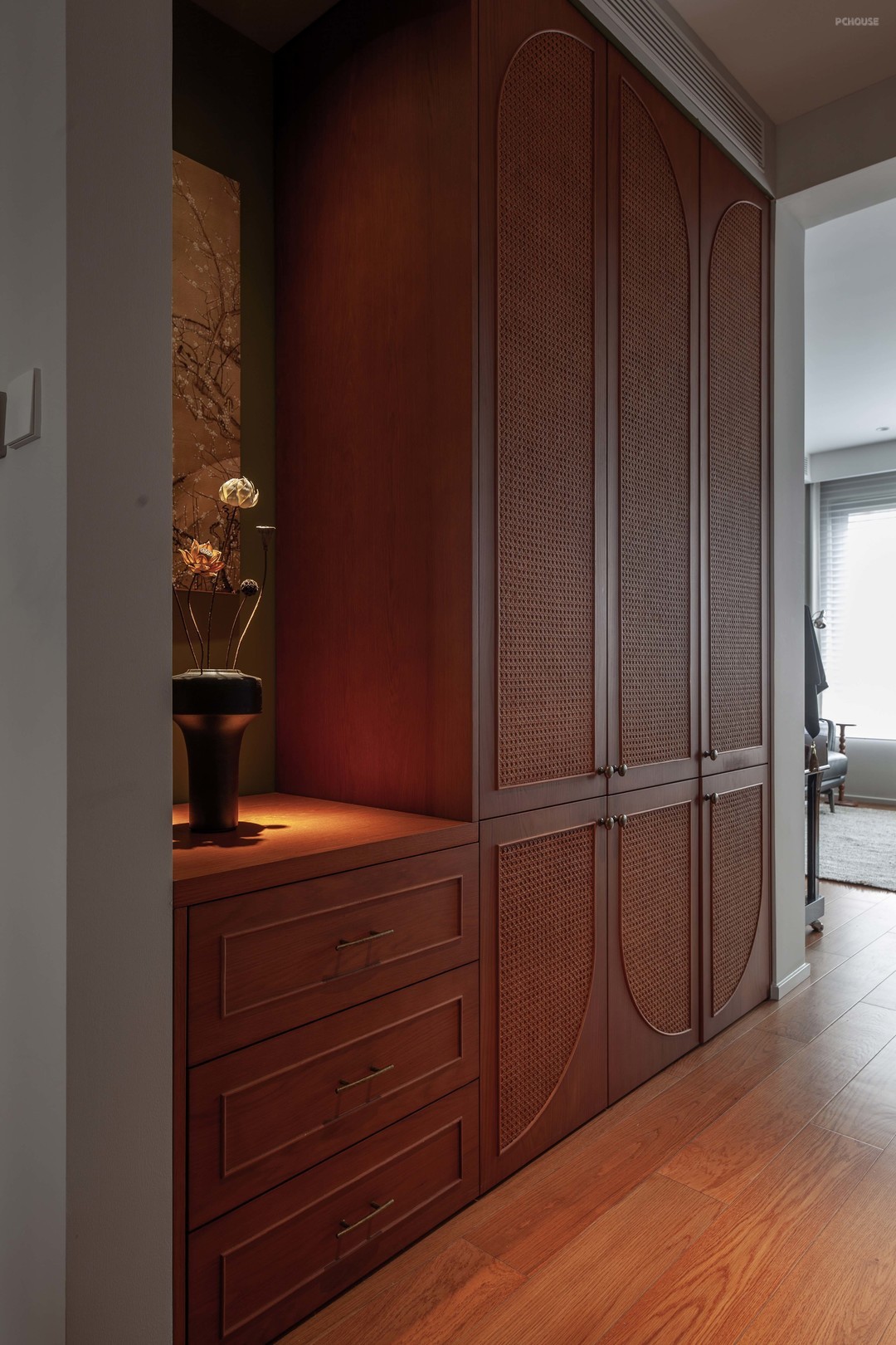玄关处墙体的移动十分有效,扩大衣帽间、容纳入户柜,更满足了后期钢琴的安置。相关的装饰也十分别致,与整个空间搭配的图画由设计师挑选,伊藤雅库楚所作的《月光下的白梅》,又临摹而成。