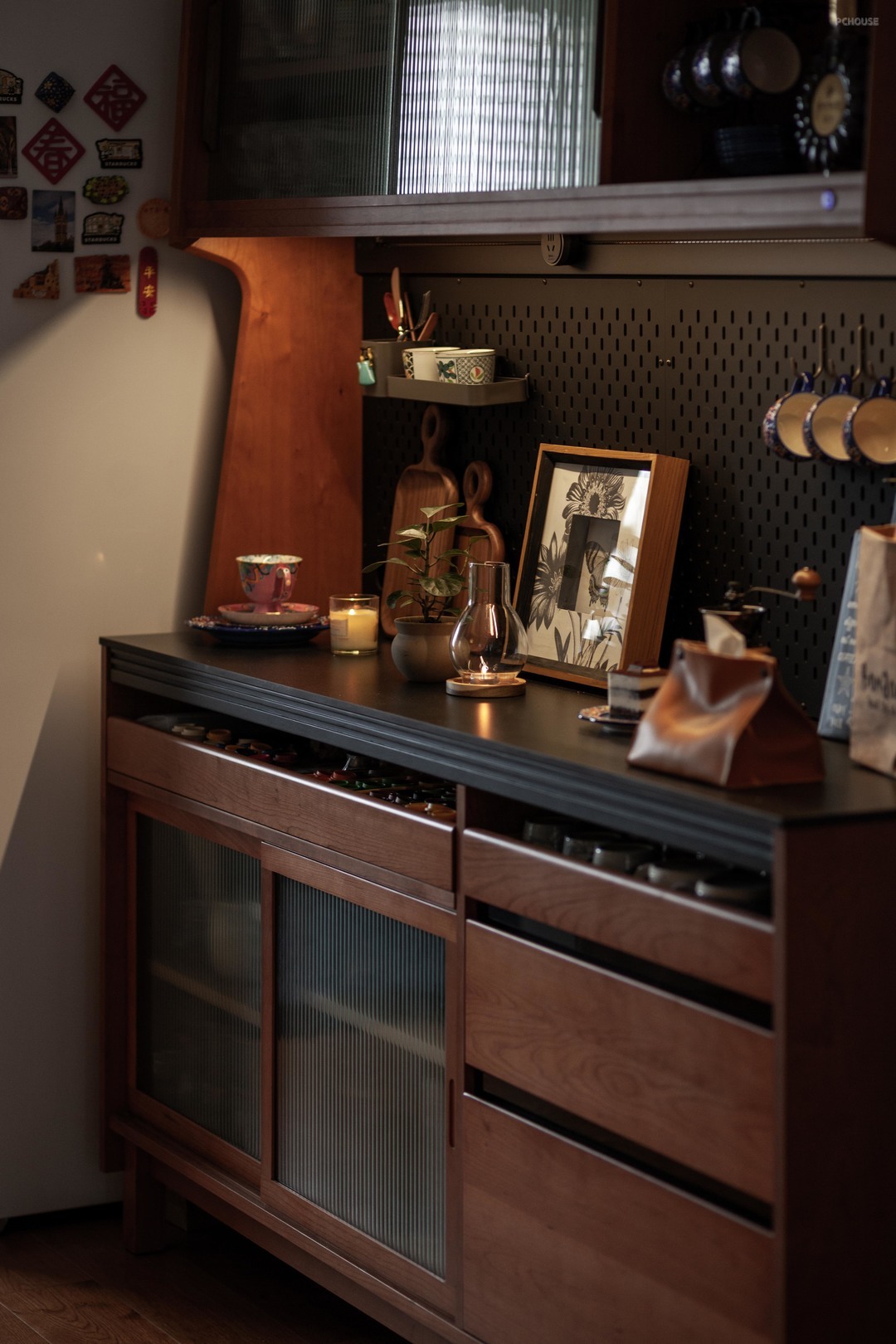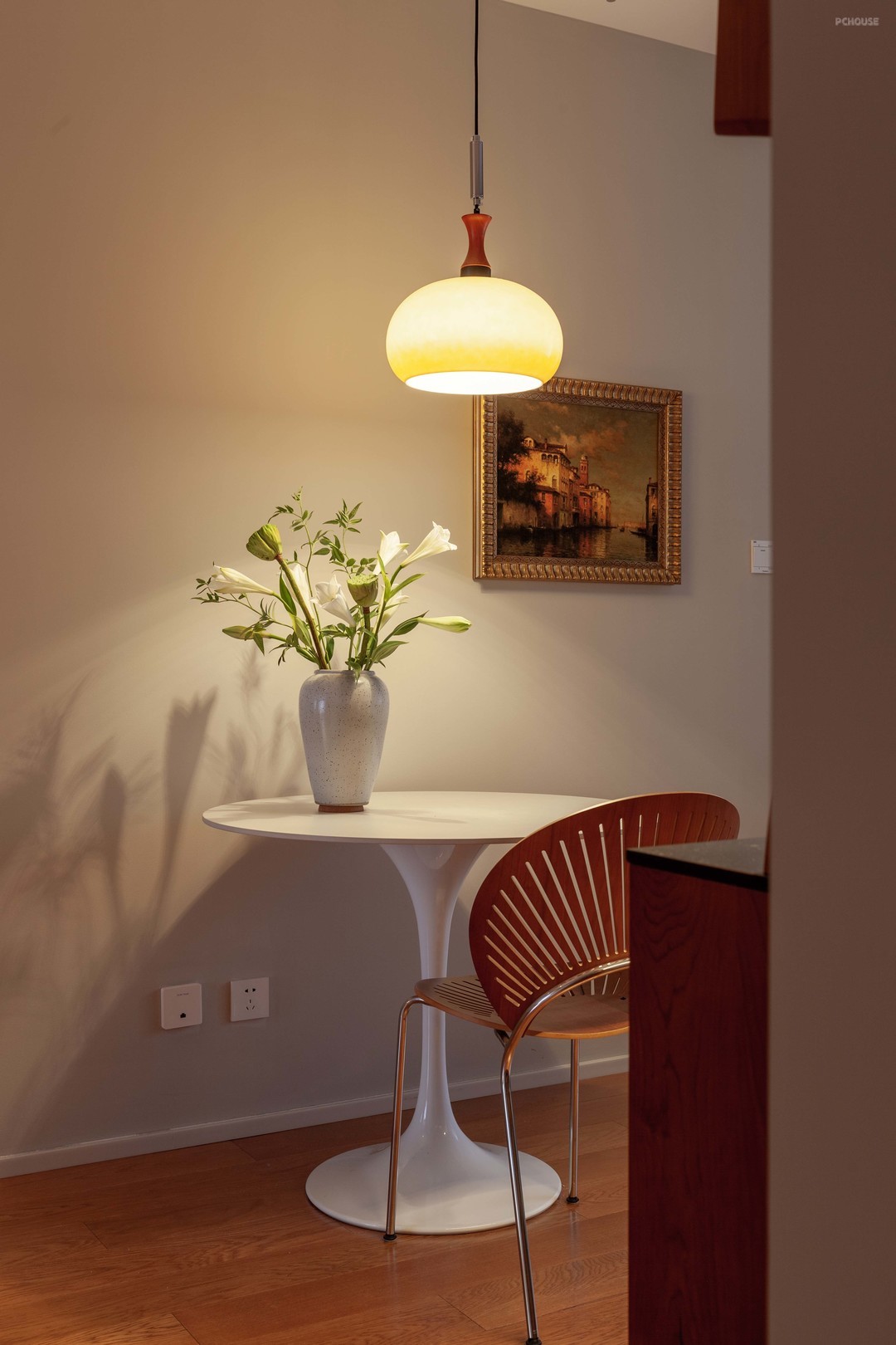 松鼠餐边柜里,埋藏了业主世界各地搜集来的宝藏——各具特色的杯子、咖啡、美酒等等;威尼斯水乡的油画、沙里宁设计的郁金香餐桌、偏中古风的灯具相互辉映。