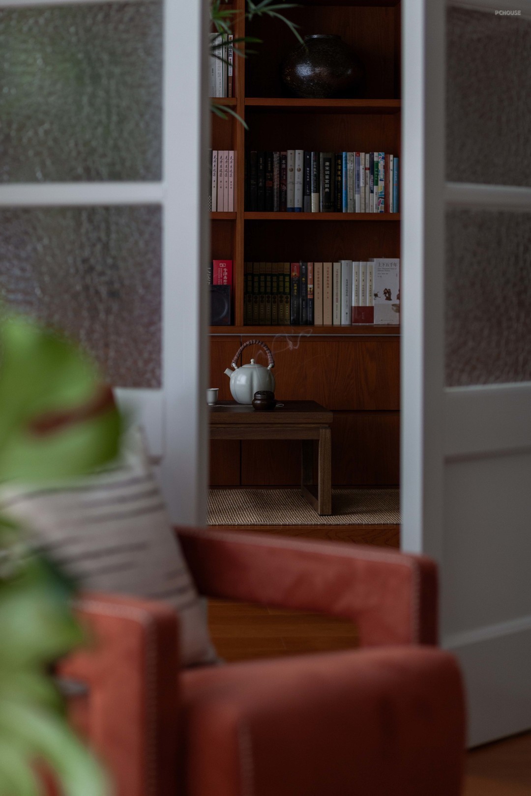 折叠门,带来了开放与私密的随时更换;满墙书柜与地台,使满足了休息、围棋、阅读、办公等多种功能。竹影摇晃的光、书香逸散的家,浸润了所有人的心灵。
