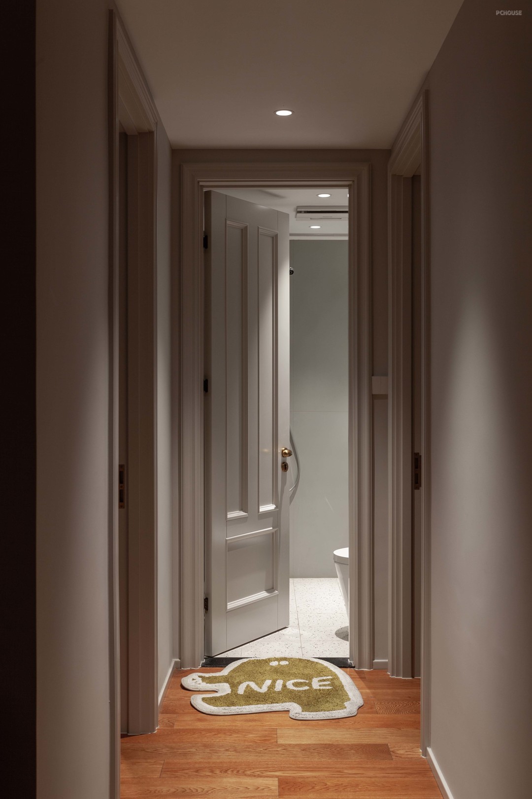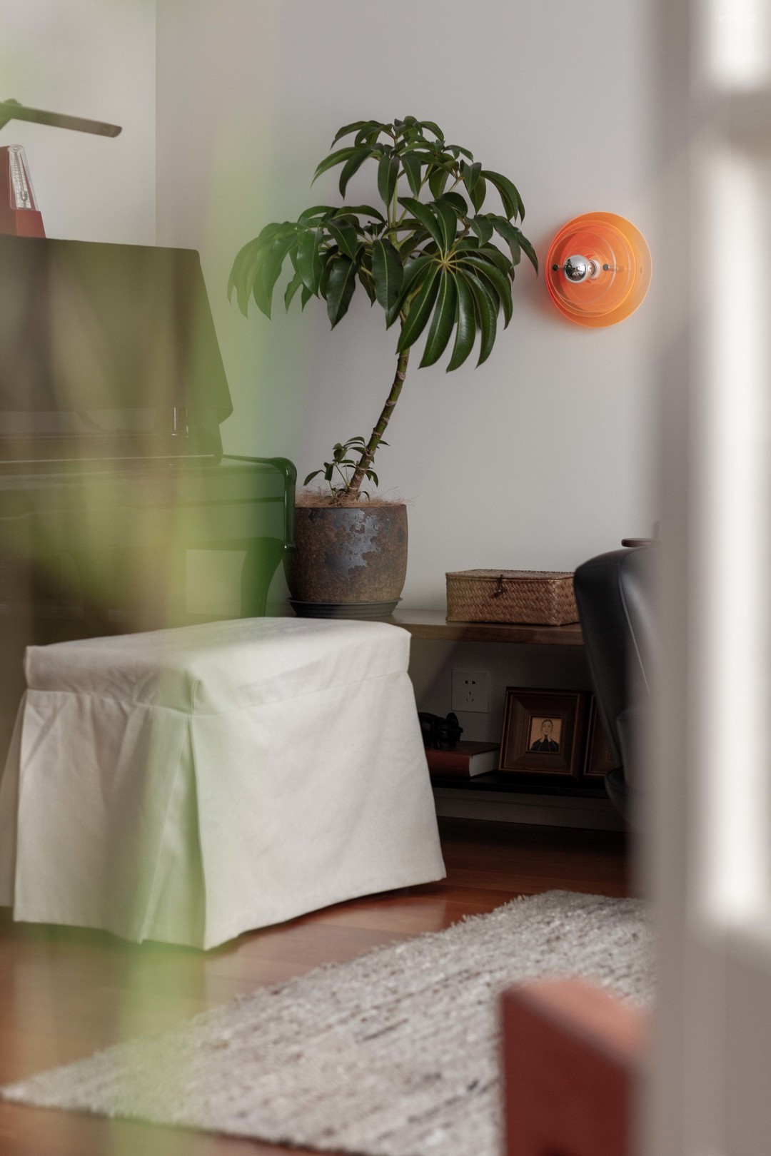 在家人的体贴与谦让下,主卫划作女主人的专用空间,盛纳她的精致生活。为了采光存在的老铁玻璃门里,晕染出昏黄,那是爱与心安的光亮。