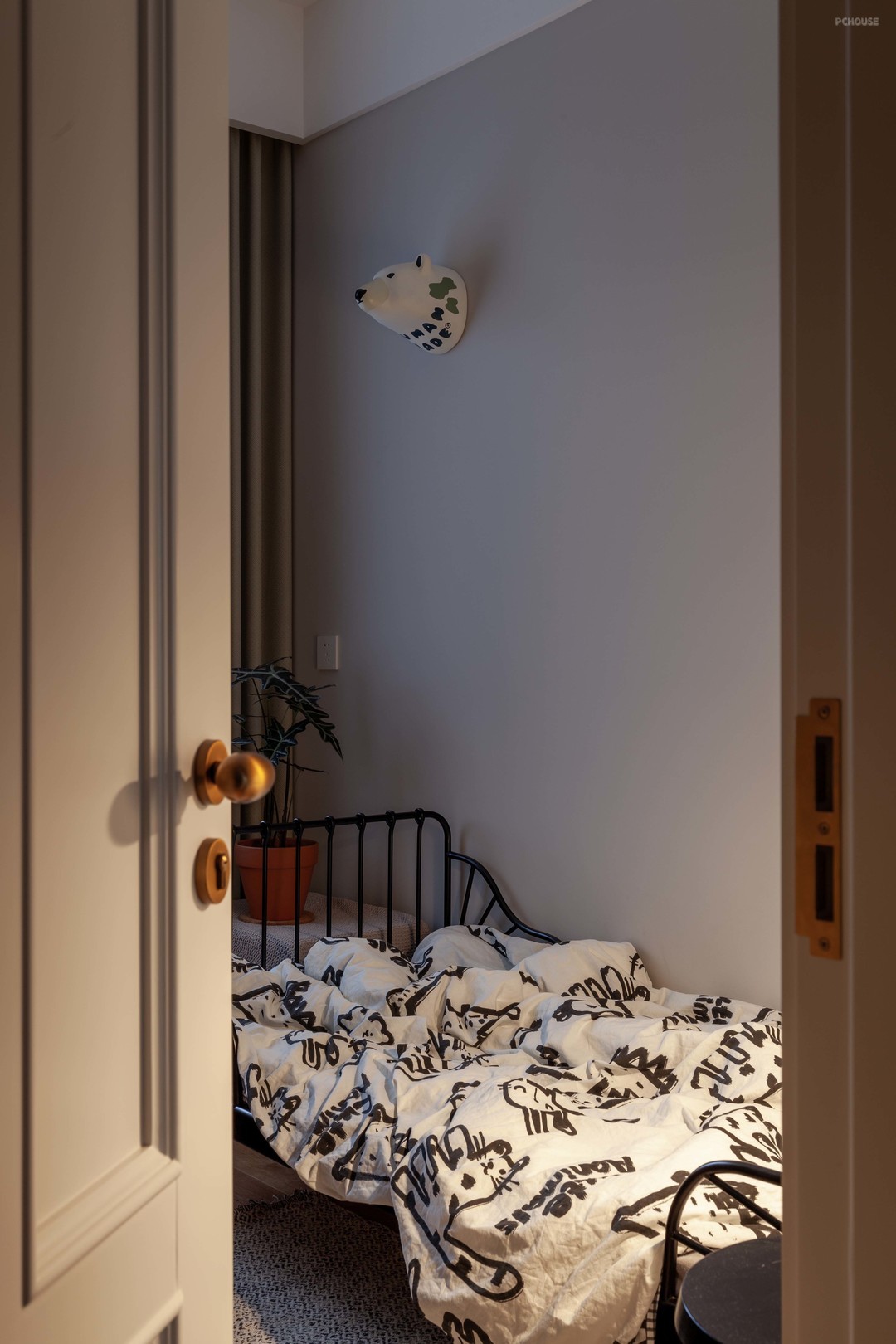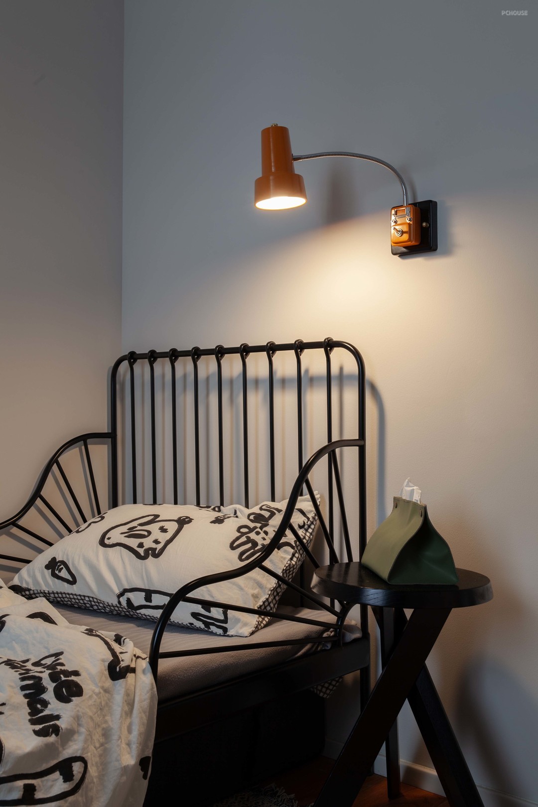 宜家铁艺床和南灯记的中古壁灯,简约又简单;而光亮处可爱的北极熊挂件,更增添了儿童房的童趣。