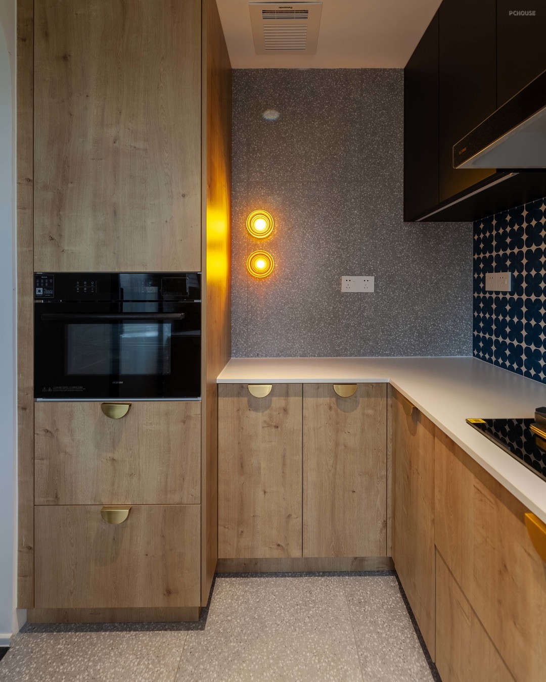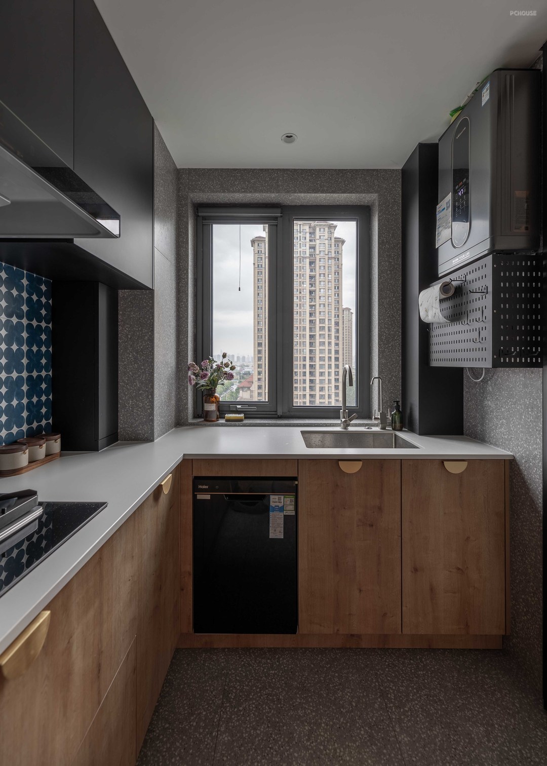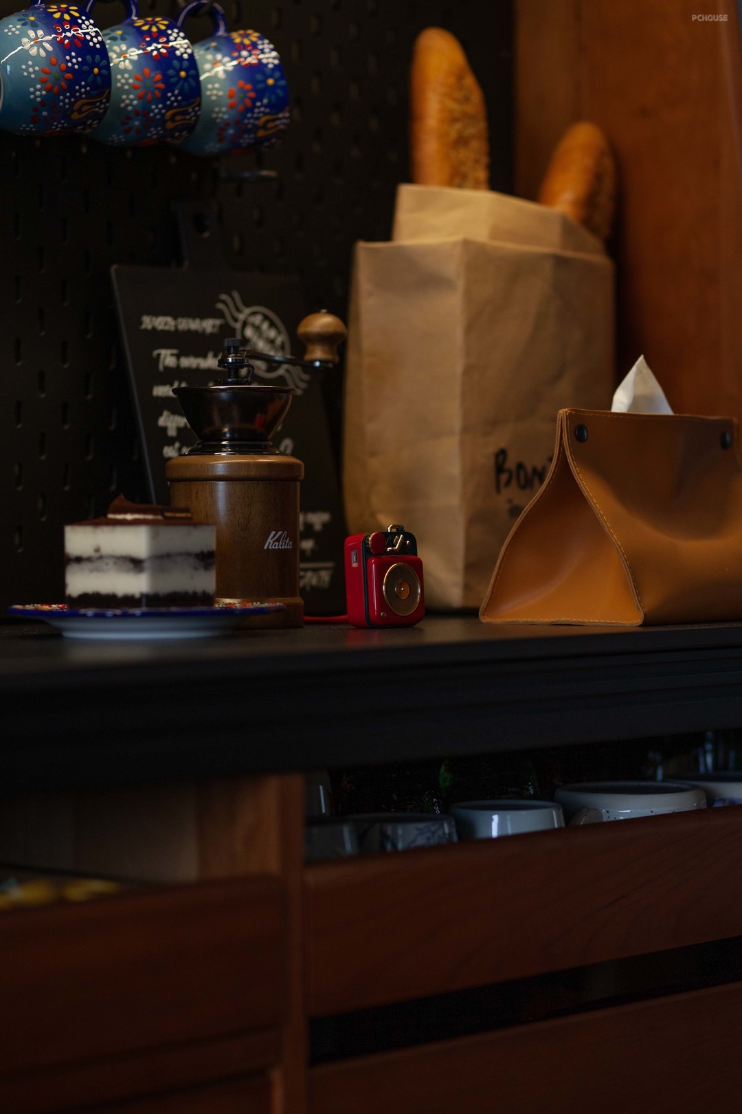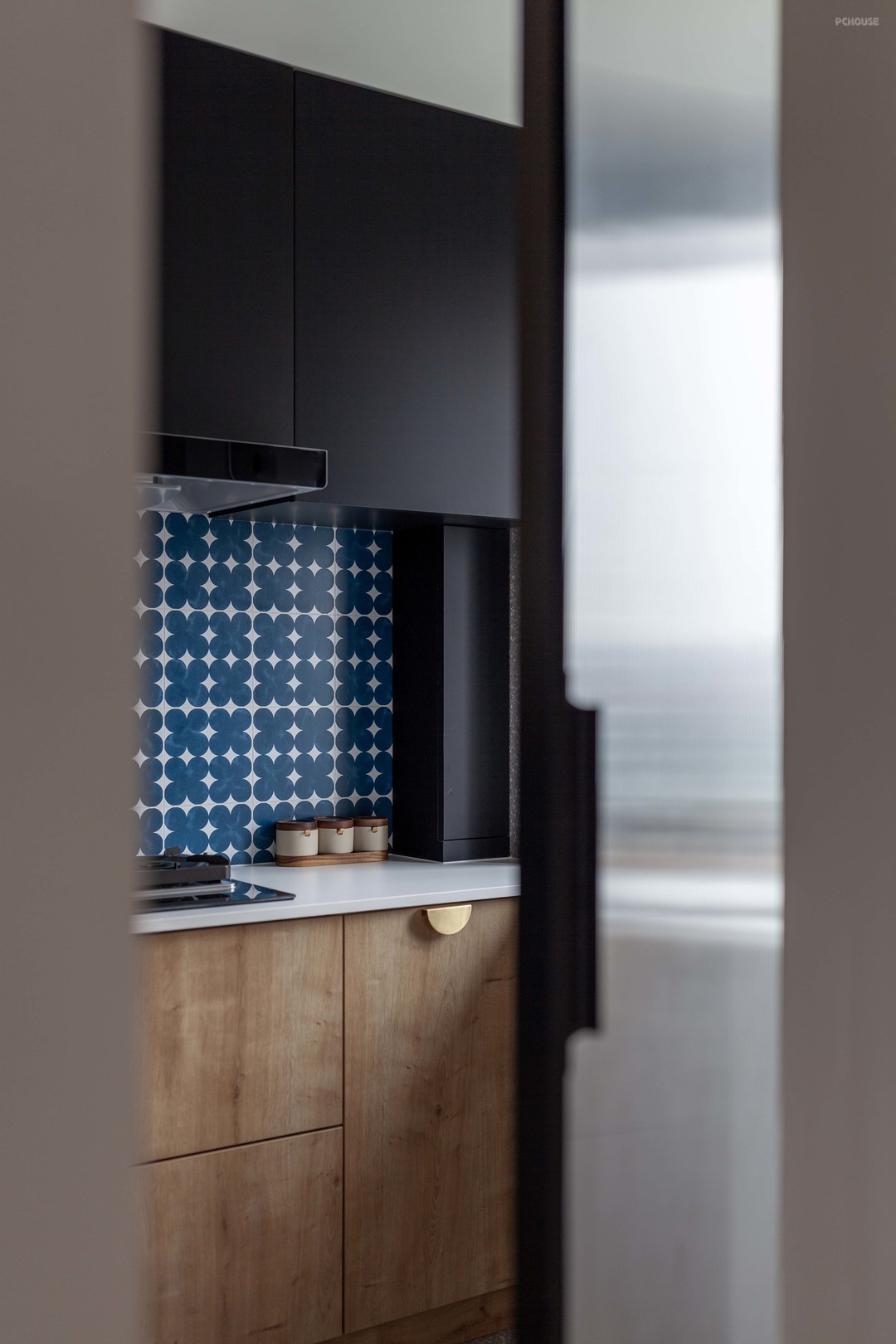 厨房整体上走线流畅、简洁大方,但细节上的点睛之笔仍毫不逊色,橱柜上的把手是设计师精心挑选而出,用柔和的形状为利落的线条添补温馨,实用又不失温度。