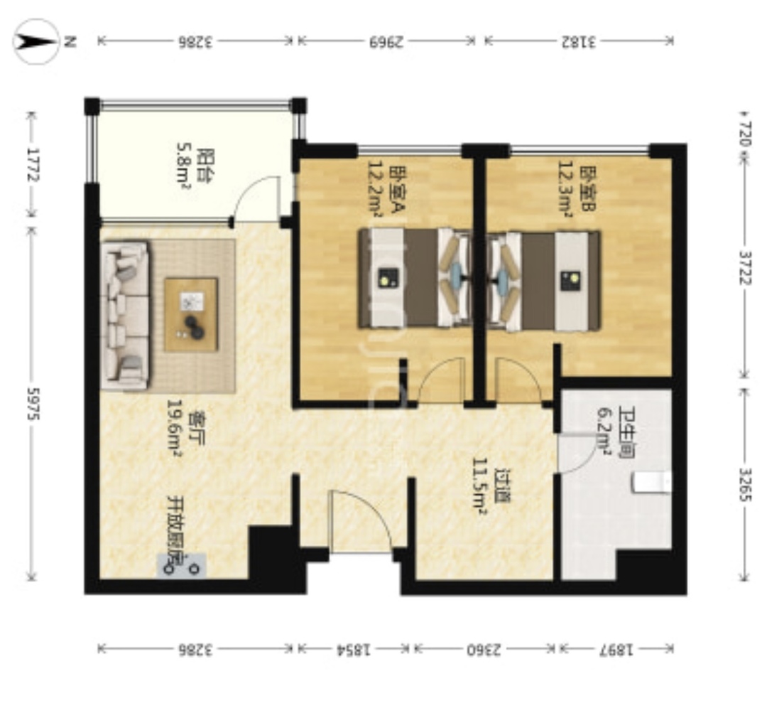 两间卧室打通改成客厅,享有两扇对称大窗户的通透。