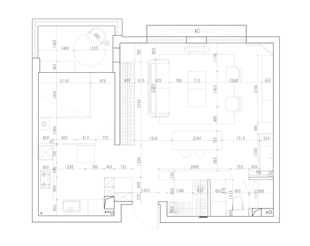最后一步,原客厅改成卧室后,中间加一道墙分出独立厨房,优化功能和动线,最终扩展为5大功能区(玄关衣帽间/起居客餐厅/三分离卫浴/独立厨房/沉浸卧室) 。