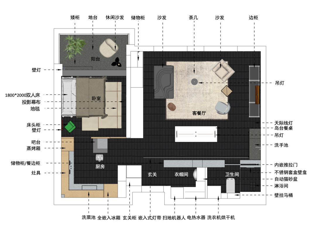 功能上,为客餐、玄关、卫生间提供收纳服务。