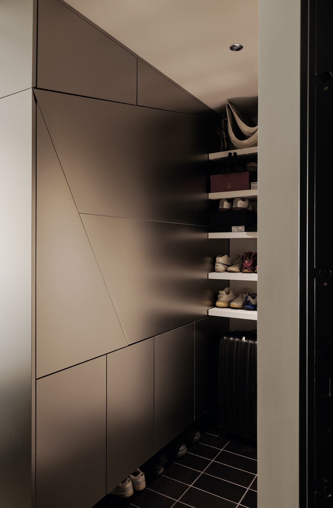 它的背面丝毫没有浪费,异形柜的植入在入户这一侧形成U形衣帽间,左边三角形和顶部的梯形打开都是储物,下面一排封闭式鞋柜,底部悬空,常穿的鞋子可以踢入。中间设置了开放式鞋架,底部空隙可以塞下大型行李箱,之所以把漂亮的鞋子都摆在外面,对业主来说,也是提供情绪价值的一种方法。