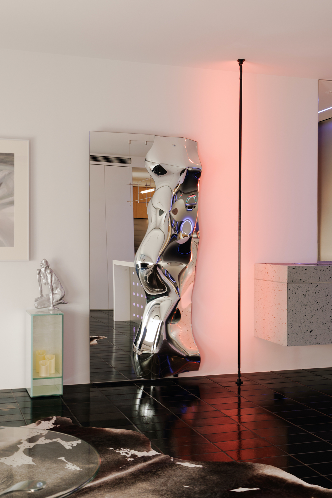 整个空间也挑选了一些艺术感十足的单品家具为空间增彩,比如这种像极了装置艺术的曲面镜,热弯工艺制造扭曲映像,也让夜晚的光线变得更梦幻。