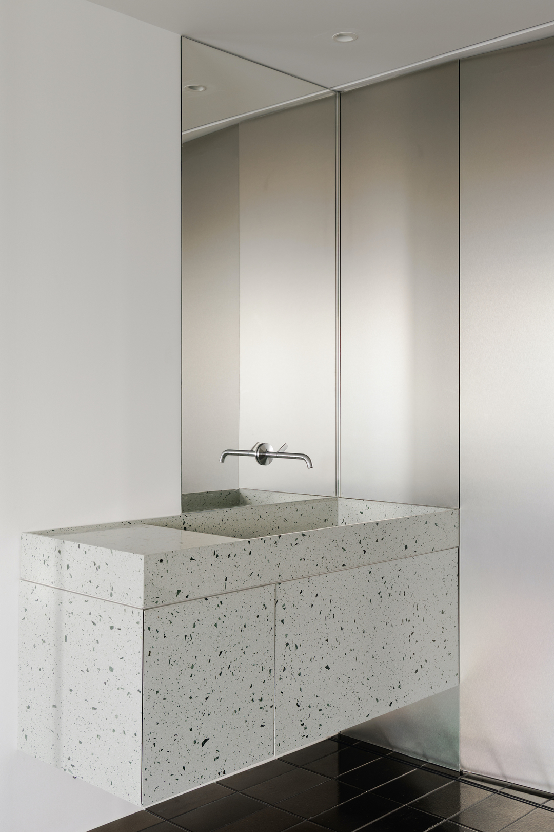 水磨石台盆选择了5厘米加厚板与背衬钢架龙骨严密咬合,台下都是抽屉柜,里面是抽中抽,上层8cm可以放置高化妆品,下层25cm深备用囤货区,抽屉的表面也附着水磨石,连地漏盖板也是同材质,让整个洗手台一种材质浑然天成。