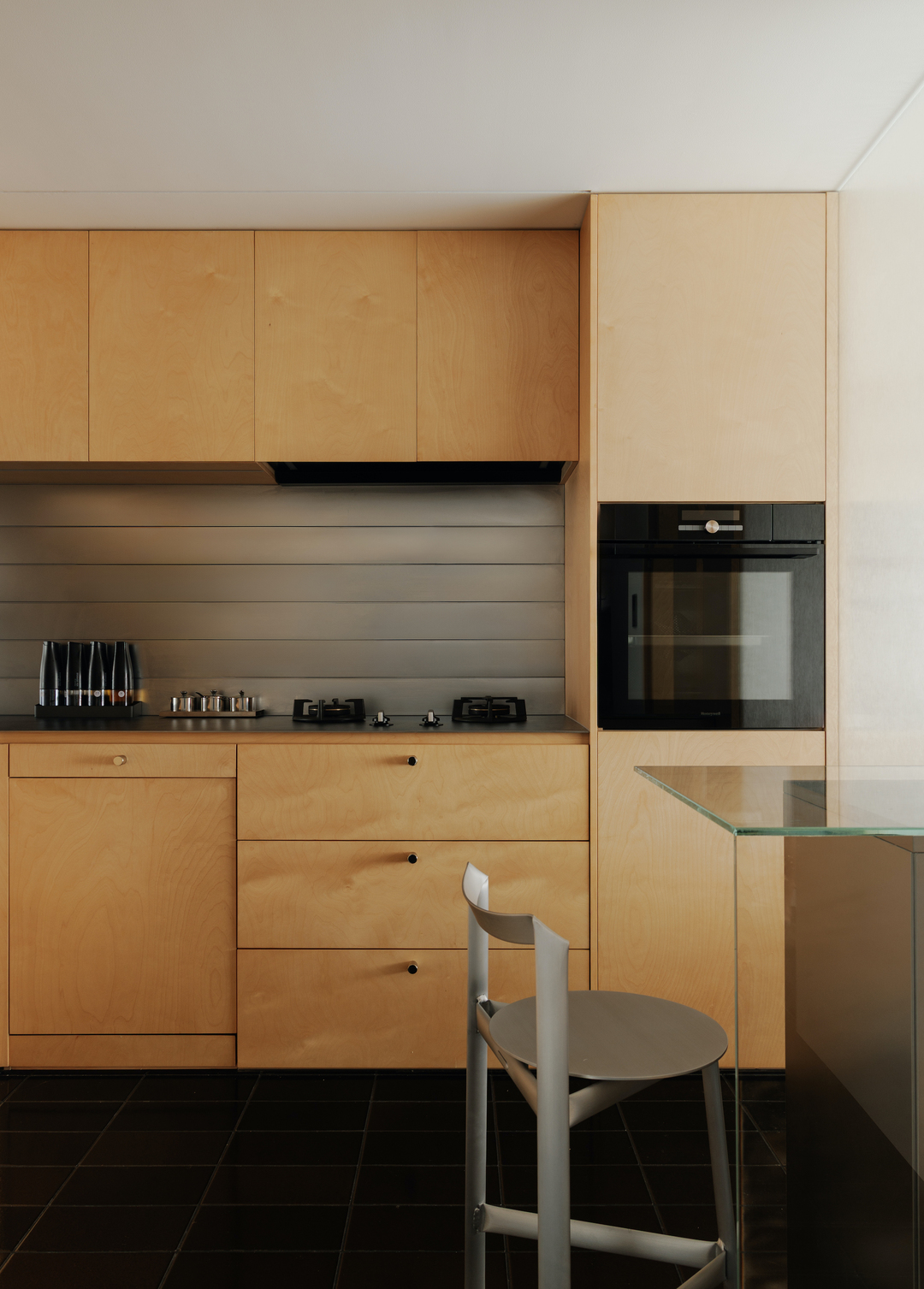 与起居室不同,厨房是一个温润的木色空间,采用稳定性高的桦木木贴皮板材,表面涂刷木蜡油,台面是5毫米不锈钢,水槽也是一体式不锈钢无缝焊接,非常耐造。