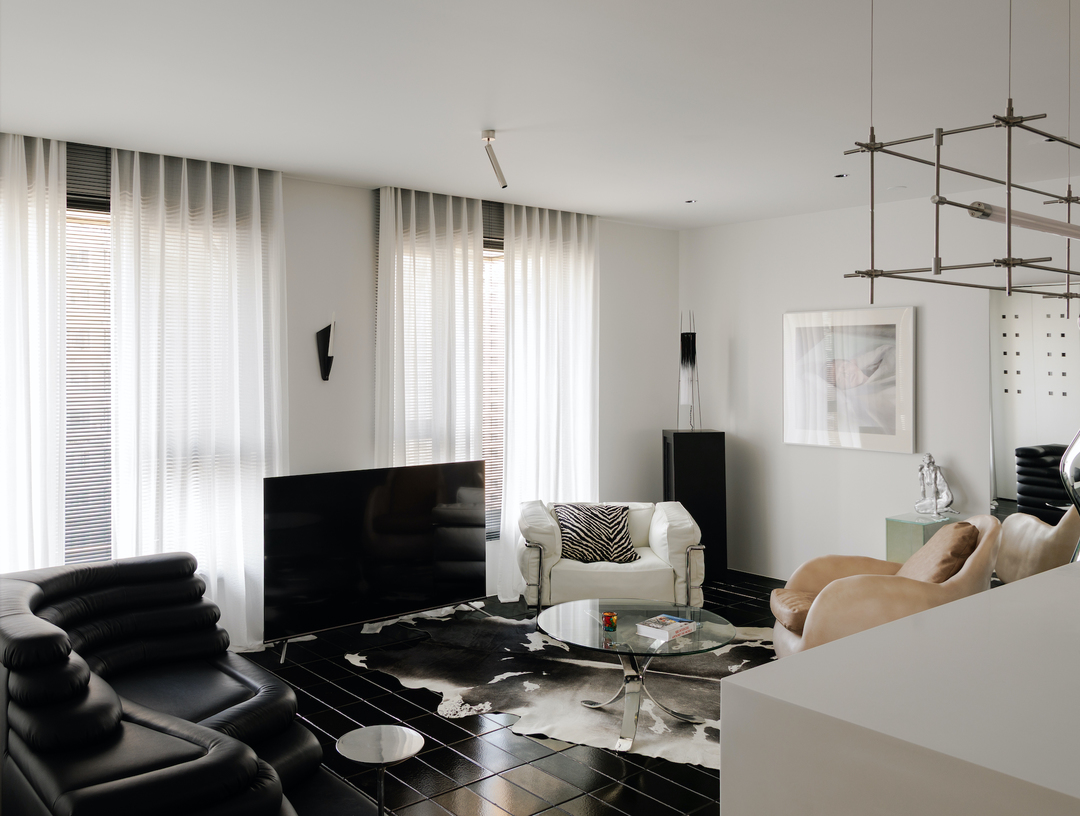 白天,这里像被阳光泡透的咖啡馆——屋主陷在沙发里休憩,咖啡香混着奶牛皮晒暖的味道,百叶和纱帘的组合筛出柔和光栅,又遮挡对面的视线。