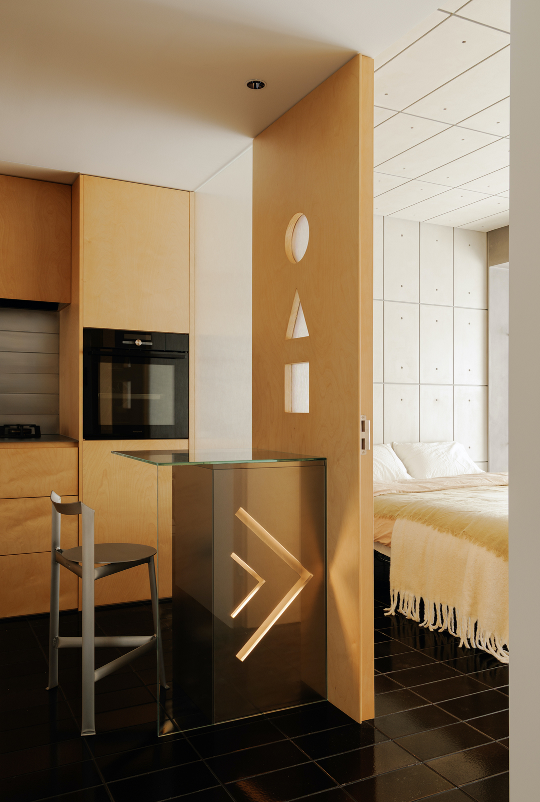 原来的客餐厨改成了厨房和卧室,中间加一个隔断分区,同时隔绝油烟,隔断上采用了长虹玻璃+几何图形的采光孔,将卧室的自然光引进厨房。