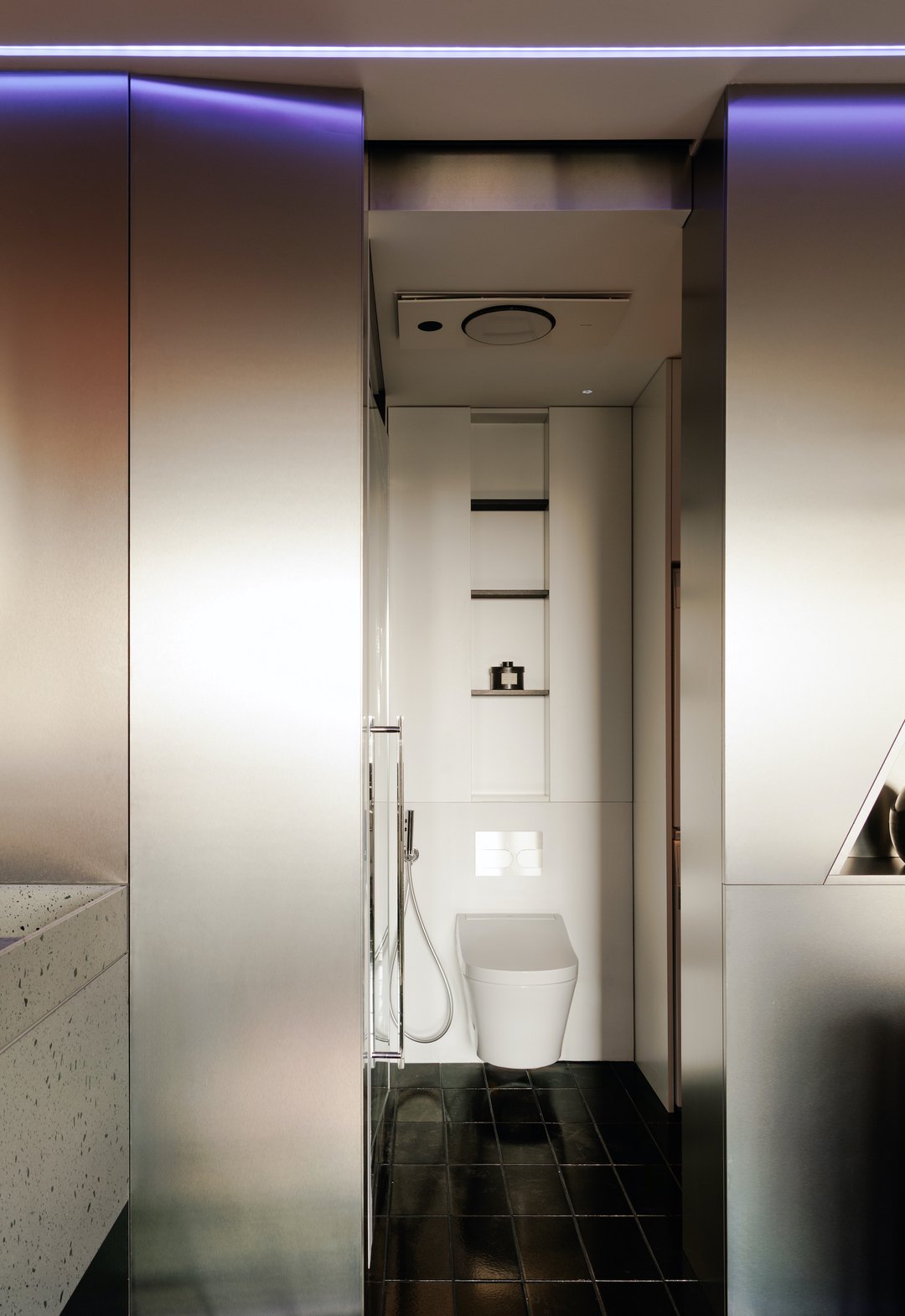 推开不锈钢隐形门,中间是如厕区,右侧是洗衣房,左边是淋浴区。