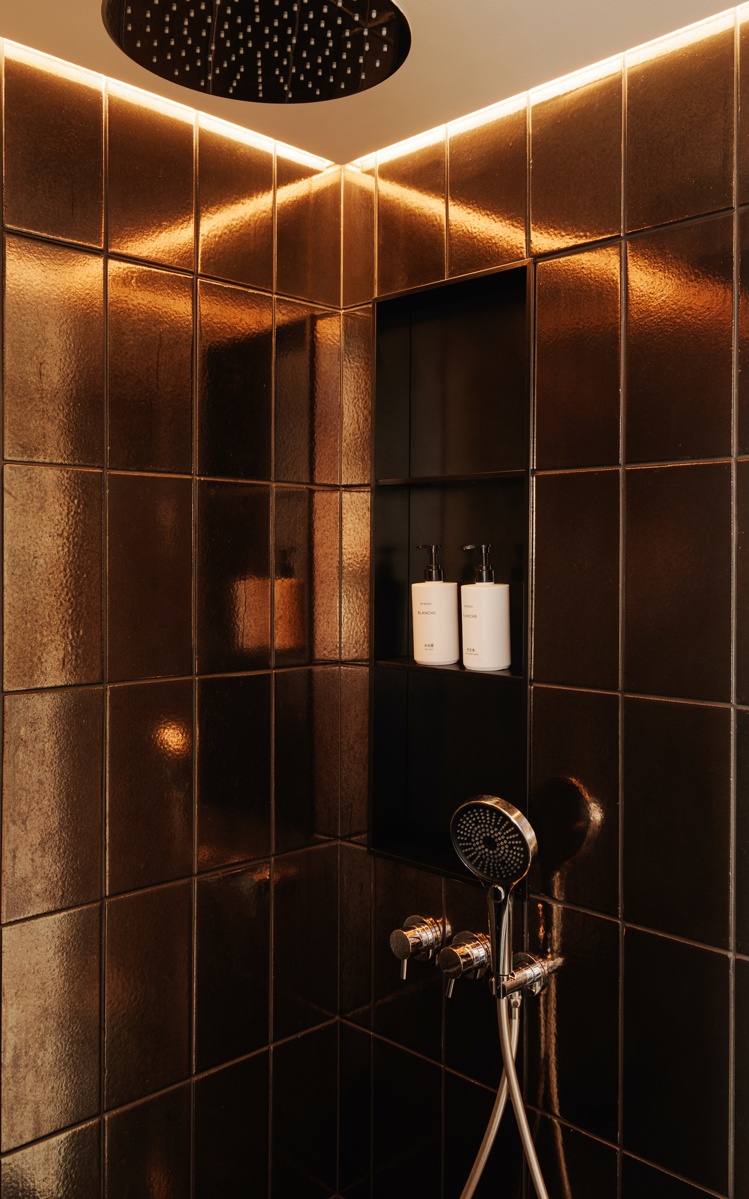 淋浴区是一个视觉、触觉、嗅觉、听觉都很舒适的空间:手工黑砖通铺顶地墙 ,把空间变成了一个阴翳、安全感爆棚的沐浴空间,还安装了软水系统,让抚过皮肤触感丝柔,在气味上,业主选的扩香石渗出的雪松香,非常好闻,听觉上,隐藏式排水管的30分贝底噪不会在夜晚洗澡时发生流水声。