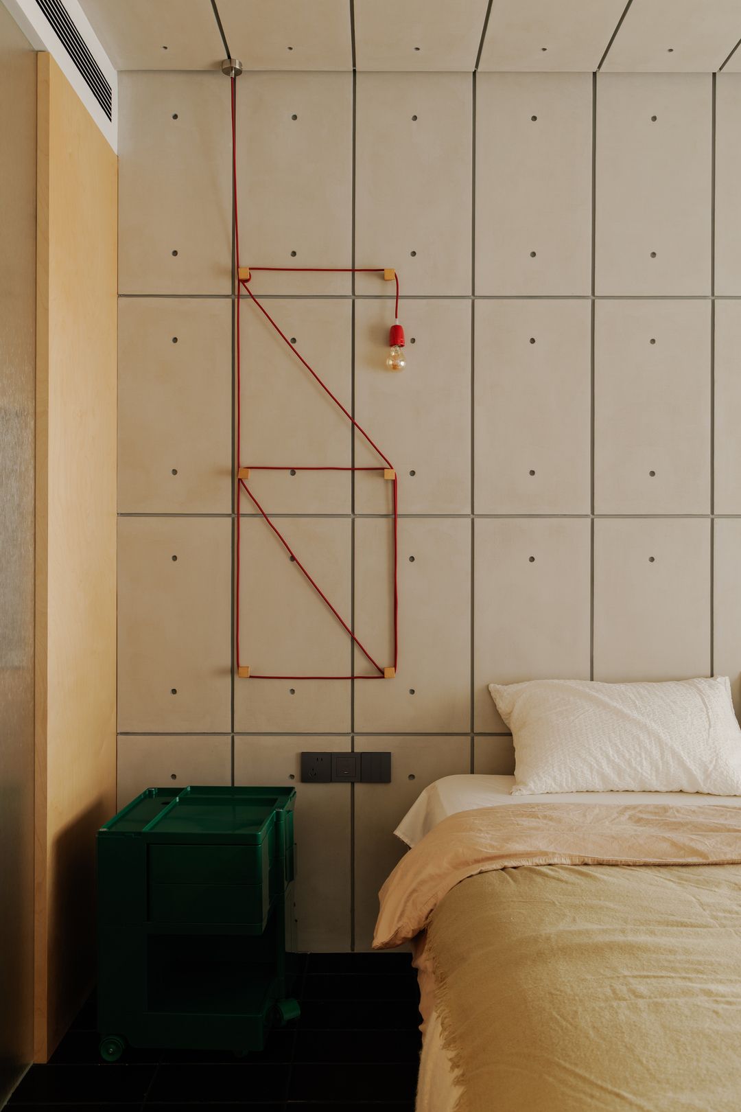 床头的造型壁灯是我们DIY自制的,红色玻璃吊灯悬在混凝土背景中,像一簇永不熄灭的篝火。