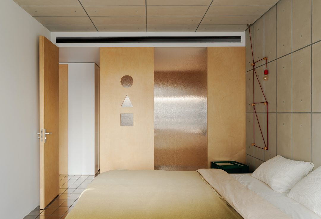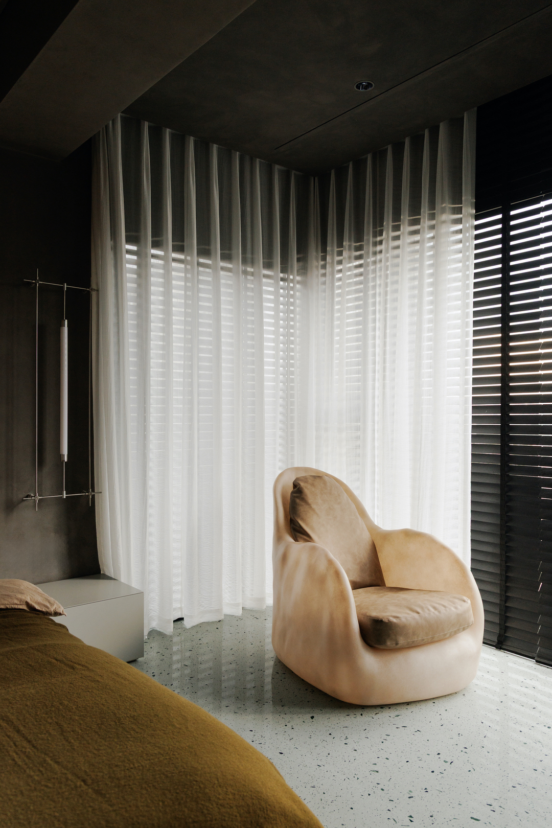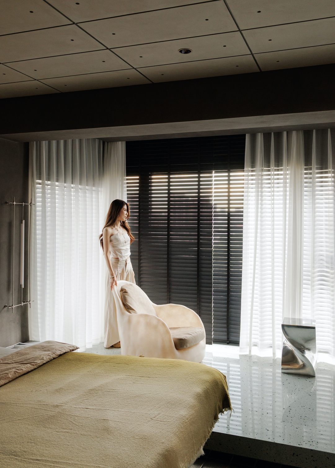 阳光打通也被包裹进卧室,成为了业主休憩的地方,不同质感的水泥效果搭配水磨石,营造清静的放松氛围,吊顶里其实隐藏了晾衣架,由于刷了同色艺术漆,使其隐形,破解了卧室晾衣羞耻症。