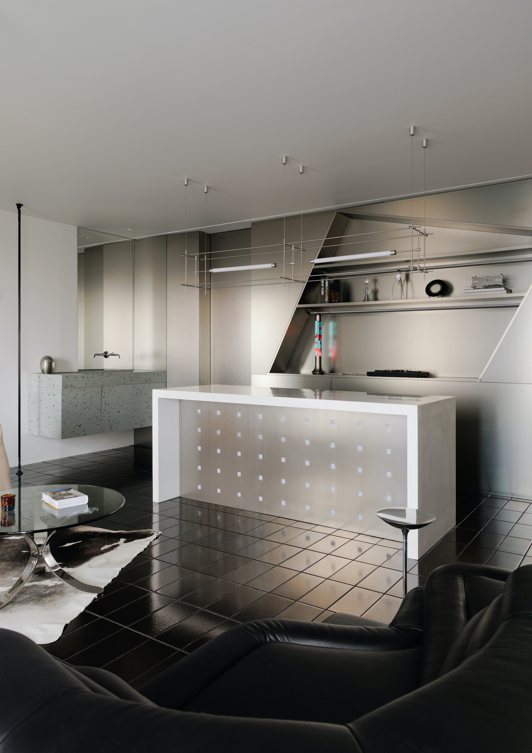 岛台和后面的隔断柜为了能在单面采光的迎光面起到散射光线的效果,都是不锈钢面,其中柜子考虑预算,采用了木柜板附着pet不锈钢膜。