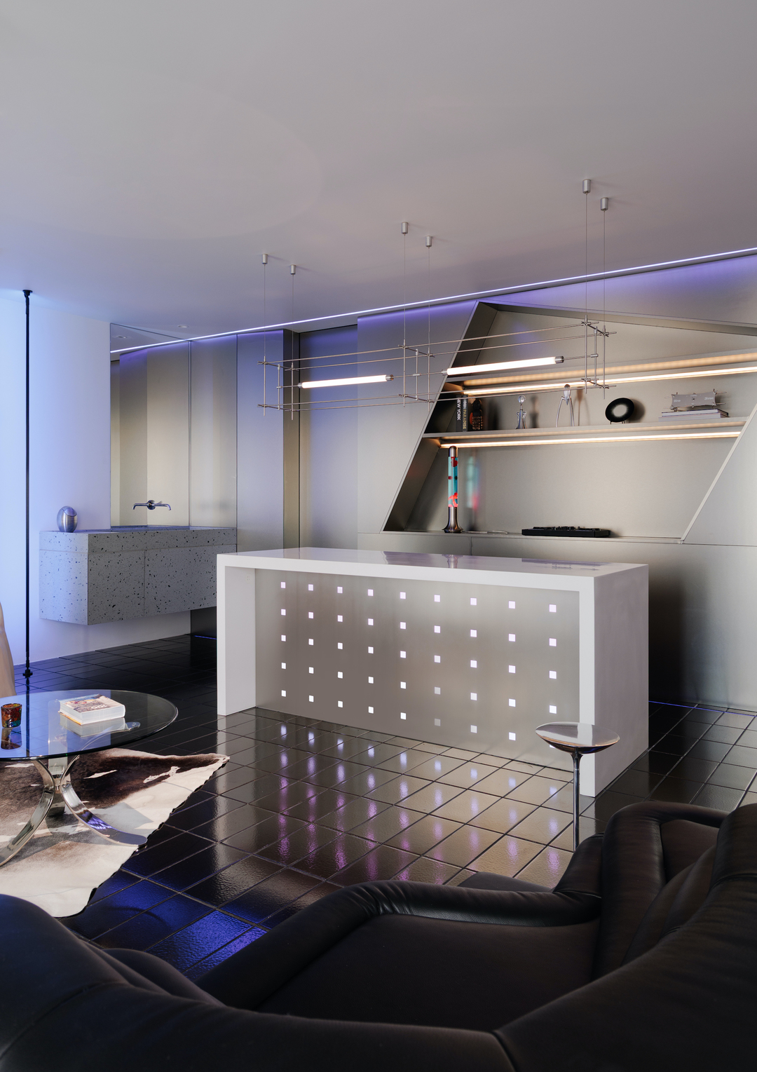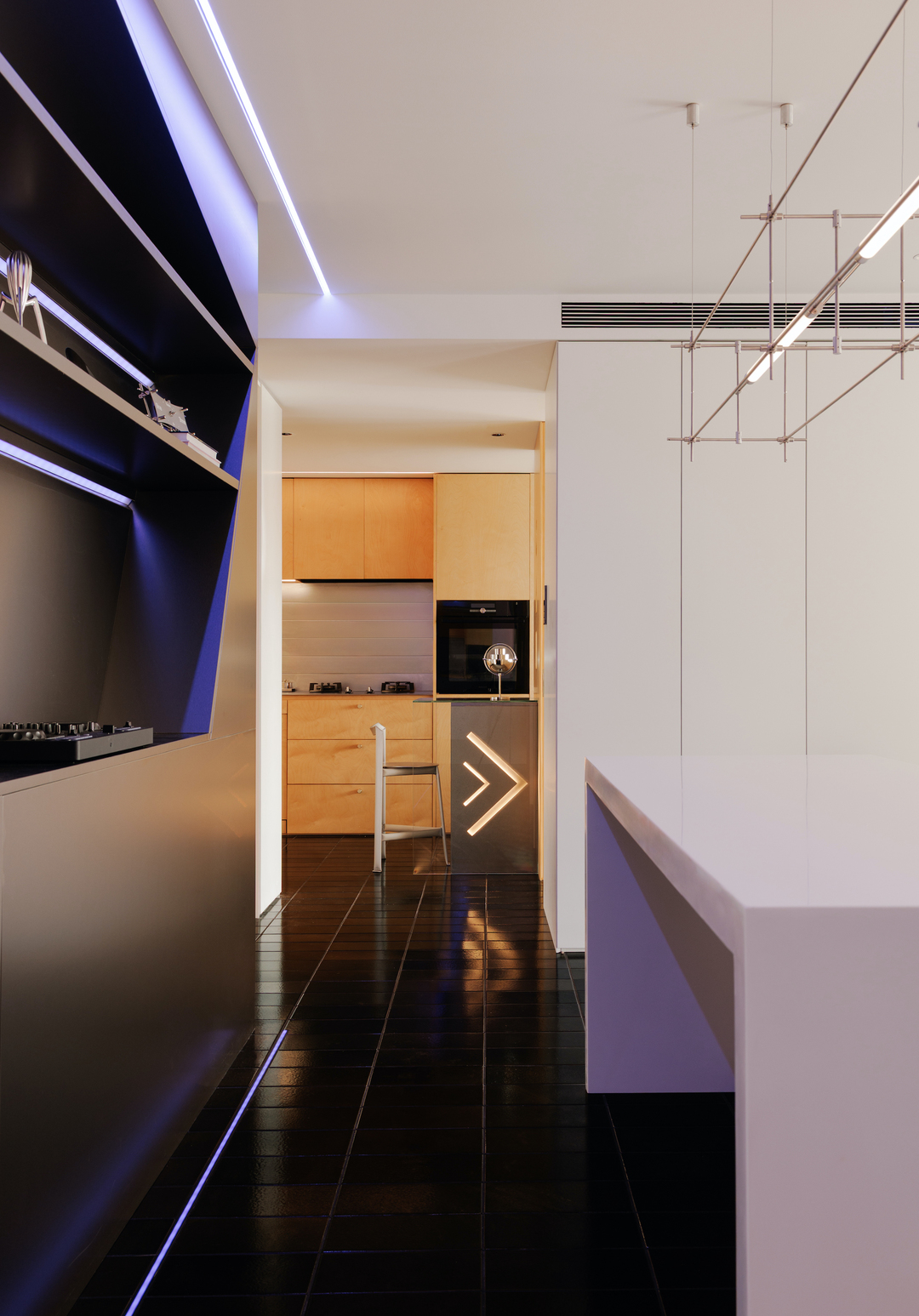 当电子乐响起时,手机轻点即启动「派对模式」——吊顶和地面的线灯带将不锈钢柜子和白墙染成钴蓝,厨房视角侧面的箭头光导装置指向卧室。