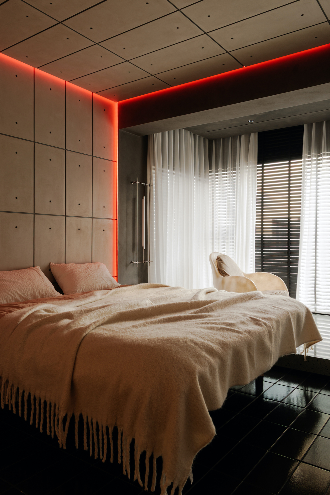 这间被业主朋友戏称“混凝土监狱”的卧室,实则是精密营造的感官茧房。