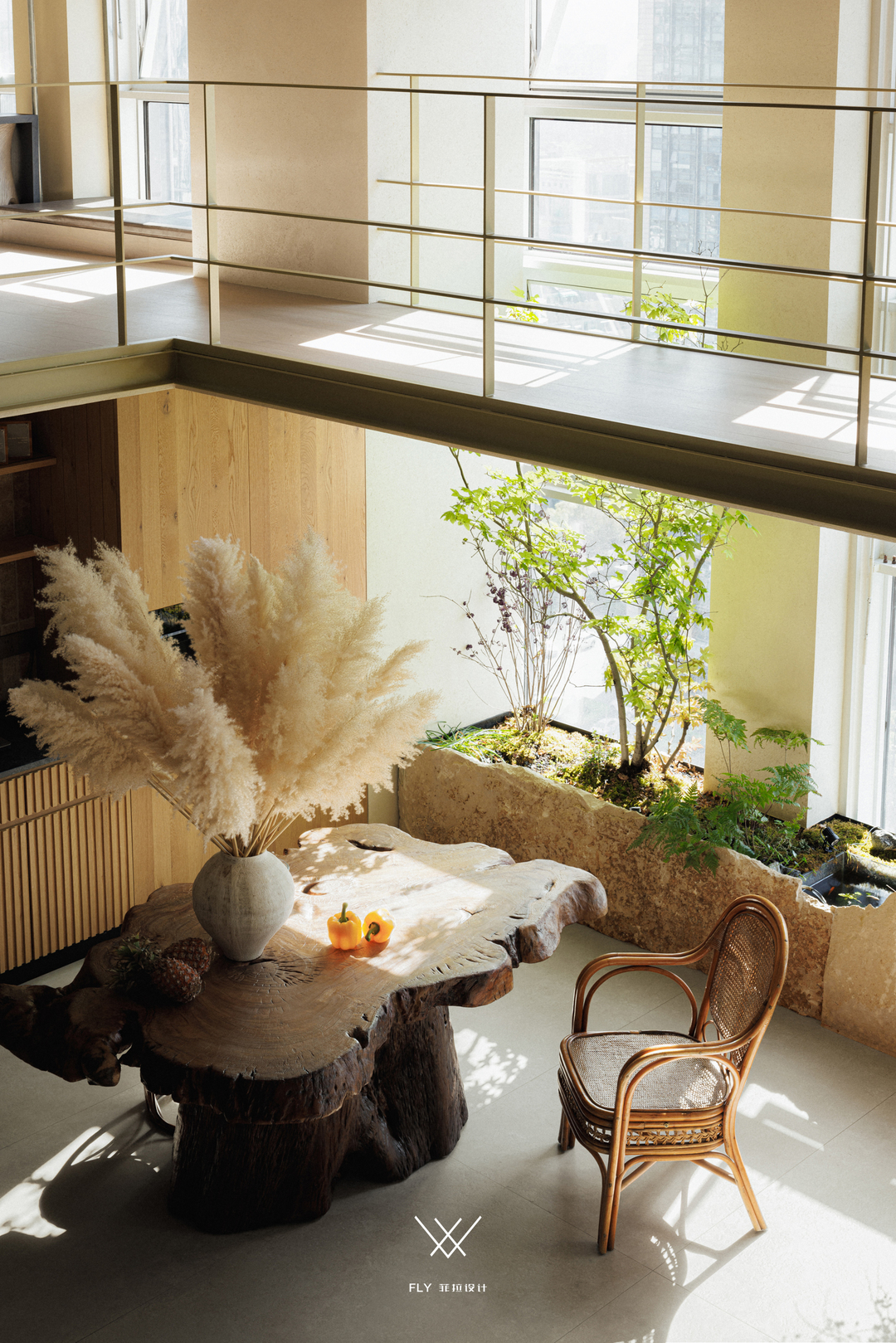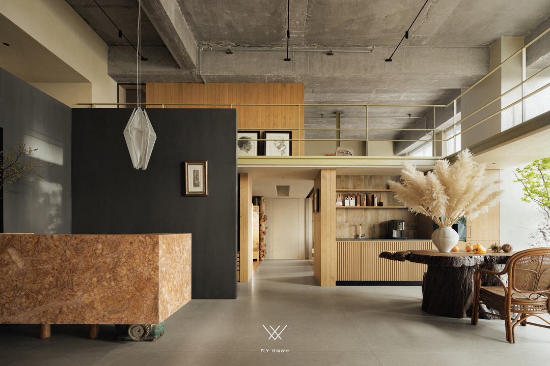 大厅是入室之后直面的第一空间,亦是第一印象,挑空处理塑造开阔大气的空间感,同时让两层空间有着很好的即时互动,大厅临窗造景山石作配,游鱼绿野映入眸中,老树桩茶几、藤椅,自然同时间作用于事物的痕迹、阶段变得如此美妙、生趣,给予人慰藉。感叹自然与人文魅力交织的同时,大厅亦有着日常生活的从容陈列,水吧台、内嵌冰箱、嵌饮机、咖啡机,满足伙伴们的日常需求,于生活的细节传递温暖与贴切。