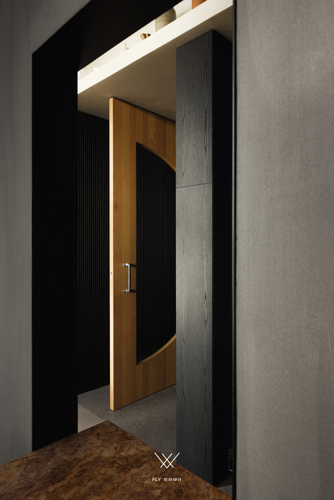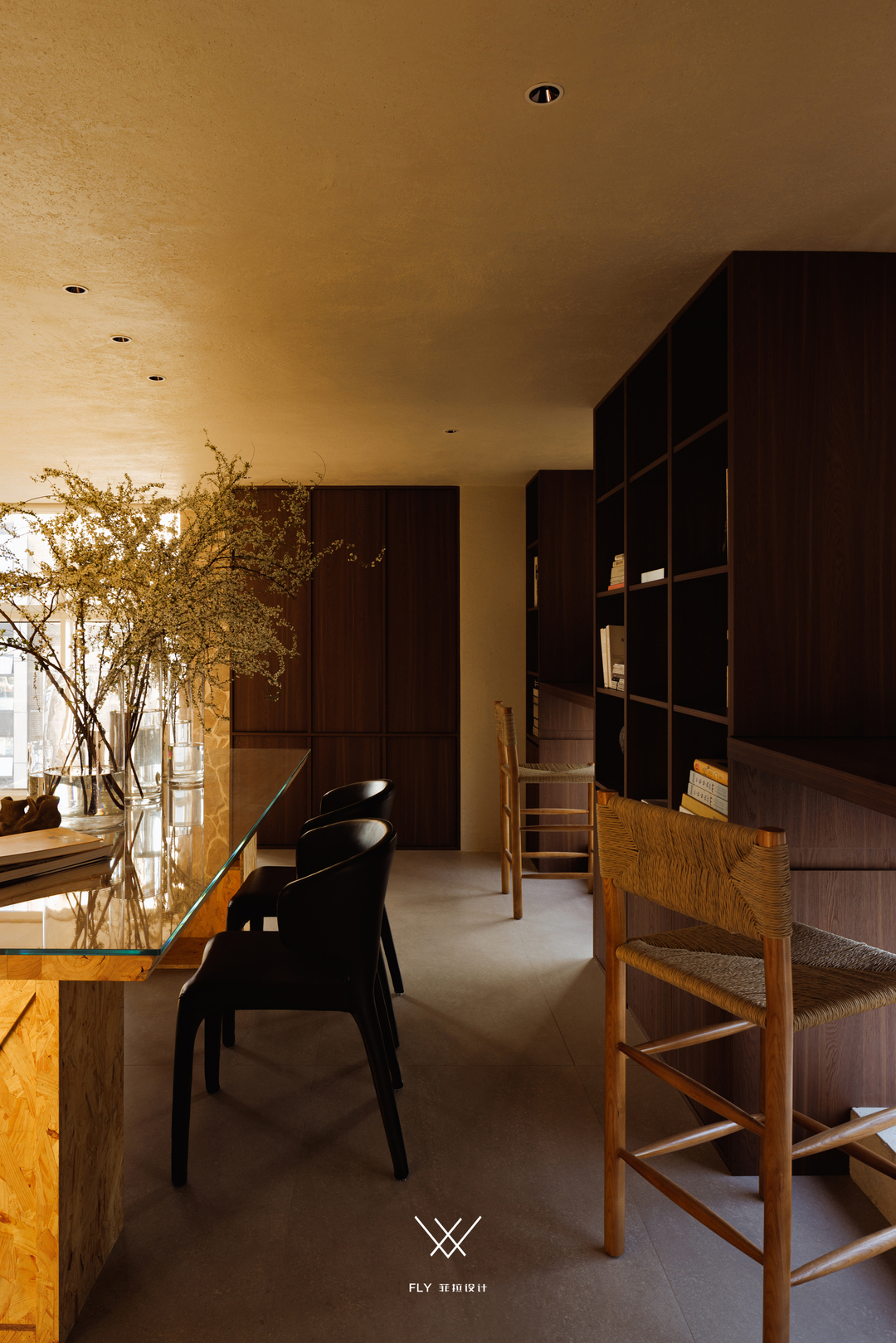 宋老师以人最为纯粹的感受与向往为足,开拓出一片精神栖息地。大面积木质元素的身影以简约的造型在空间内铺陈开来,墨黑与原木色为主调,典雅而松弛的言语与体块的穿插留白,极富肌理感的墙面、顶面与粗粝不规则的山石,都市与丛林的交融碰撞,收集的空间碎片串联起的故事拼图越发清晰。