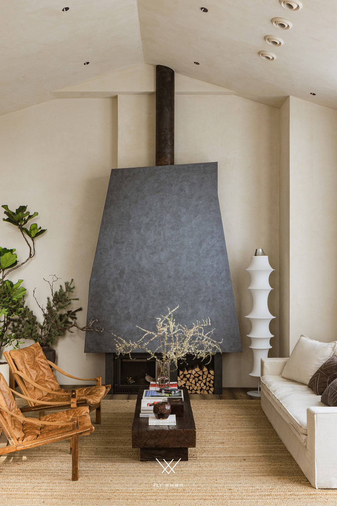 关于壁炉的来源,它的灵感来自于一个九岁的小小创作家——宋老师的女儿·可可。在最初设计期间宋老师总觉得空间里差了些味道,在家构思到深夜转头睡去,手稿堆满书桌,第二天早上发现在手稿上多了一个形状,可可的画就像是一把钥匙打开了他思路的大门,看着不规则的轮廓涌起一股灵感,宋老师以女儿画的形状为基础进行深化,有了如今别饶风致的壁炉造型,空间自此也有了它更丰沛的故事与情感。