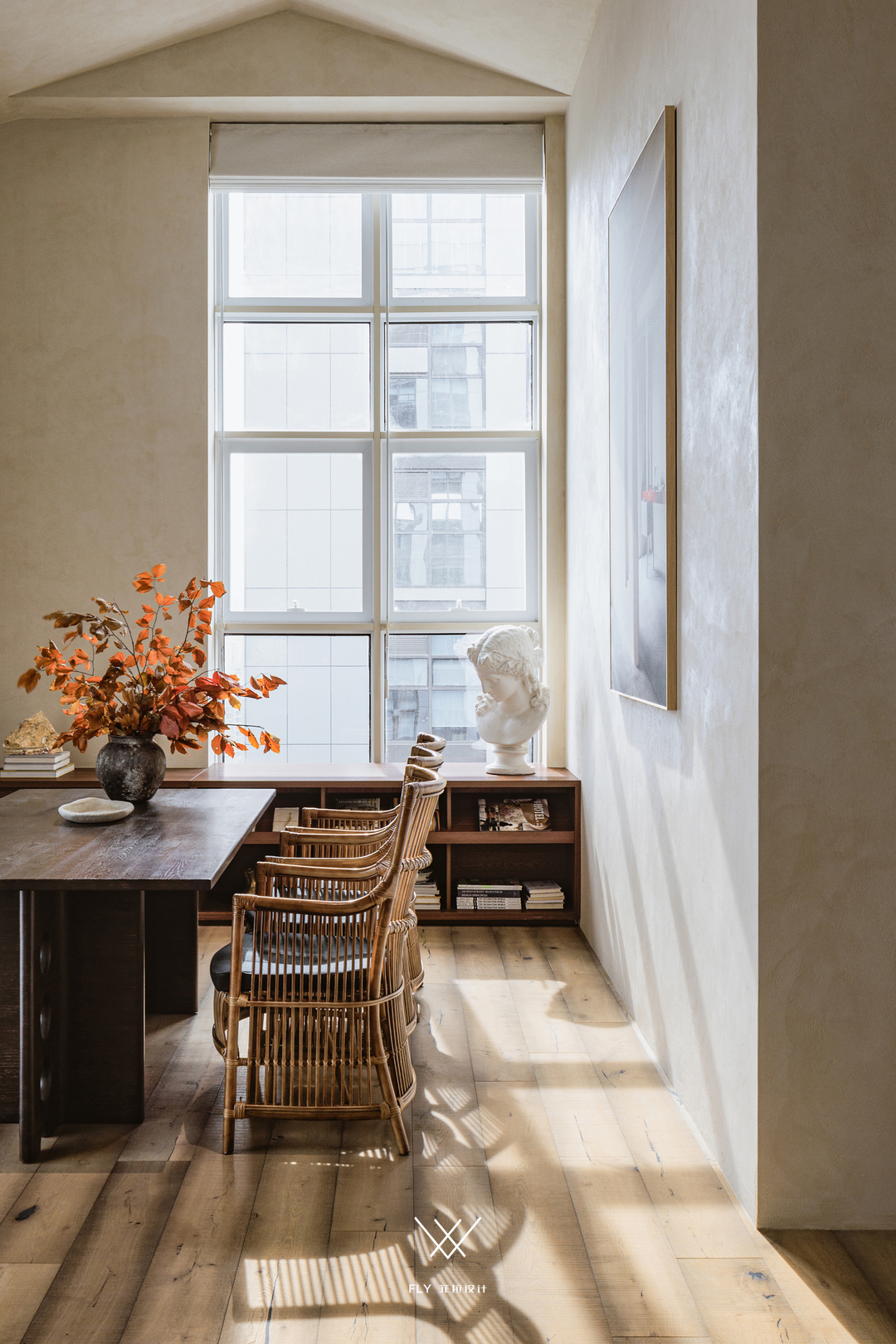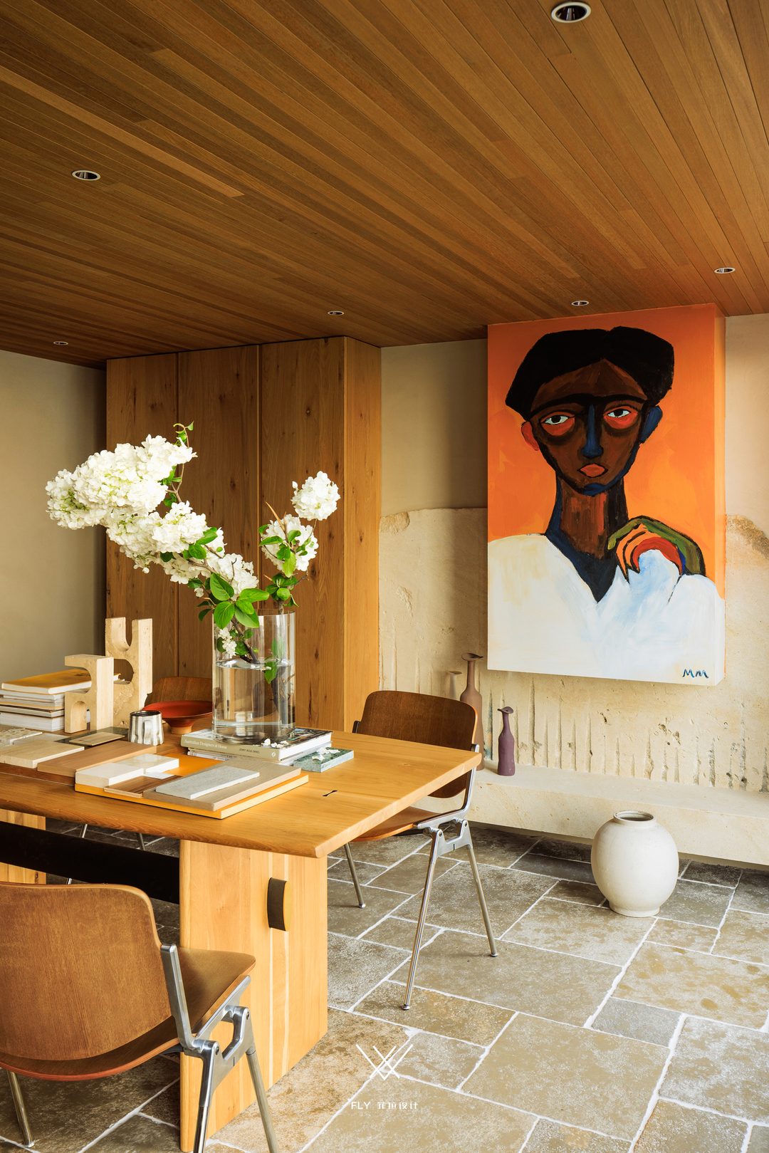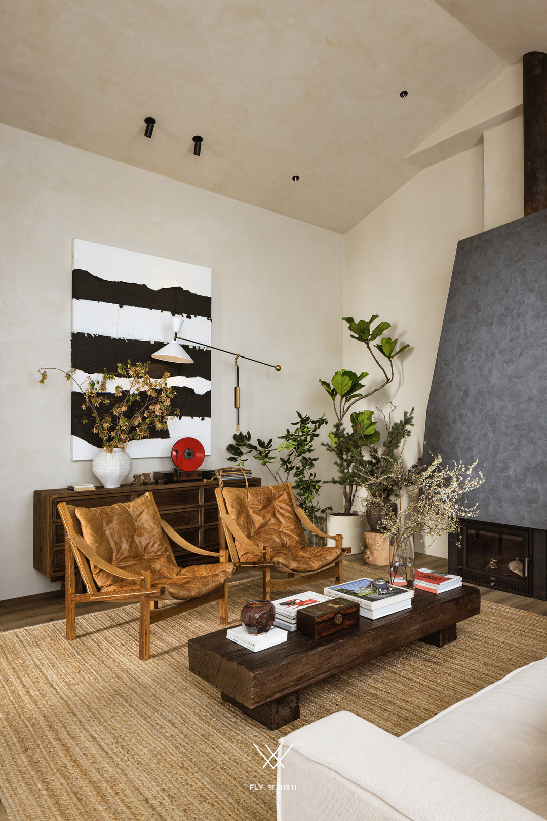 更具野性美的当属人物挂画背后的石头,开矿放料打下去的炮孔形成了它边缘的竖条形态,被扔在市场的一角受雨水侵蚀发黑,是偶然、是冥冥注定,让偏爱具有时间痕迹物品的宋老师遇见了它,废弃的石料在新的场域里散发不可替代的光彩。正因为它的不完美、它的瑕疵、让过分美化、过分理想化的布置变得不再生趣,有不协调、有残缺,传递着野性的生命力、生生不息。
