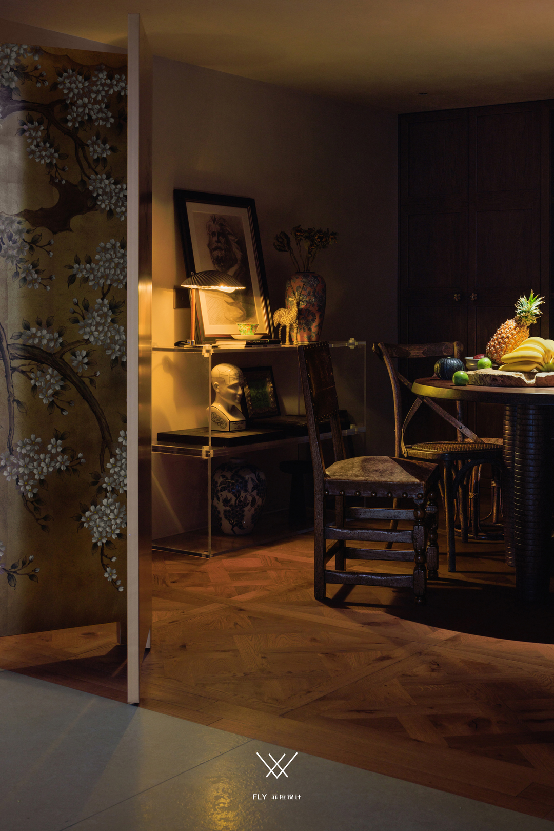 三把座椅是淘自于19c的欧洲老家具,还有一部分老家具、椅子是民国时期的老物件,同时做了复杂的欧式雕花与整个空间做融合碰撞。复古地板、旧木饰面、浓郁复古的空间色调,富有历史与人文的家具摆件散发着厚重的故事感。