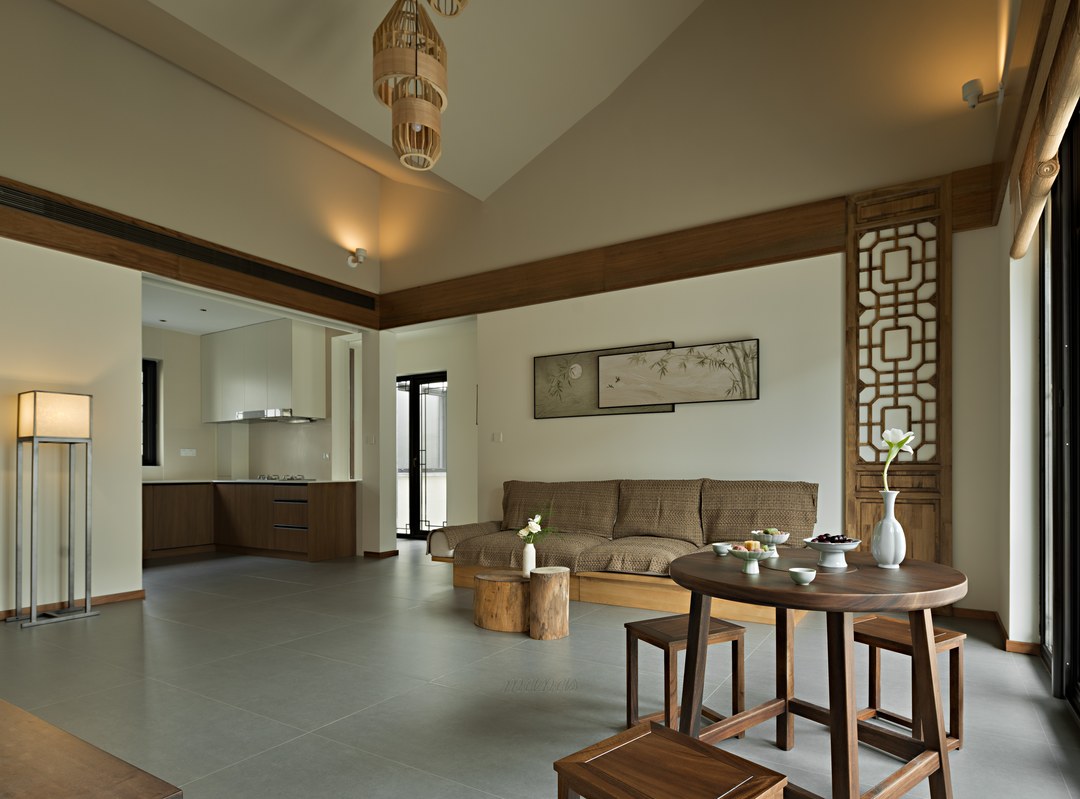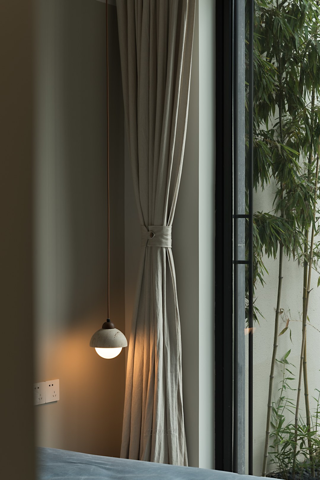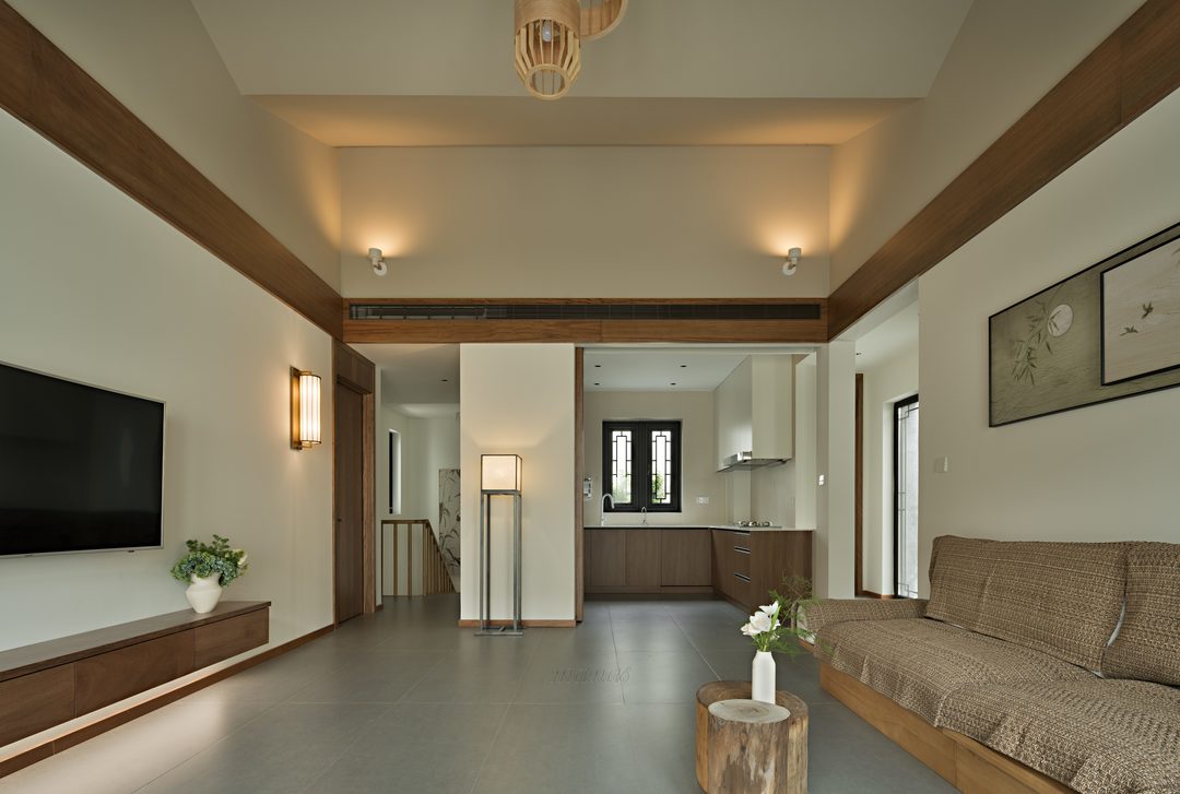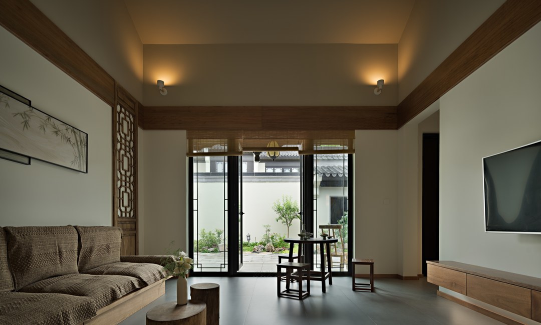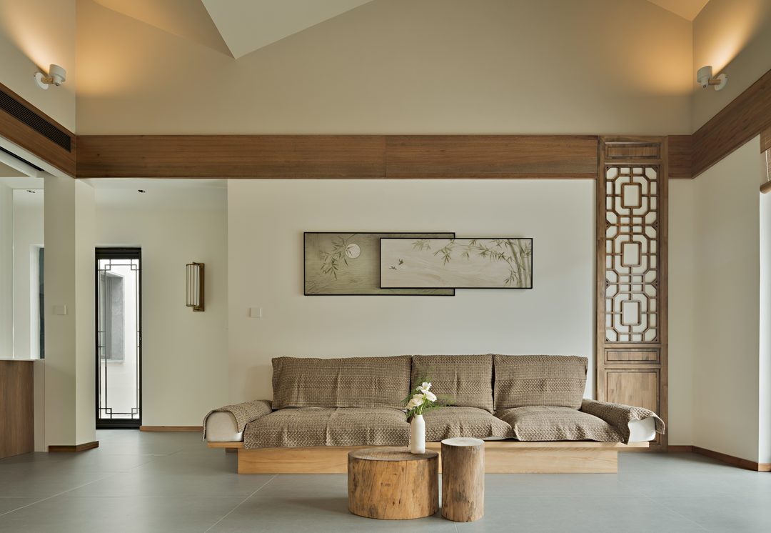 合院户型分前院后院,客厅所在位置位于中院,客厅部位做了端井,寓意绿芜墙绕青苔院,中庭日淡芭蕉卷。是业主对家具氛围与环境的期待。