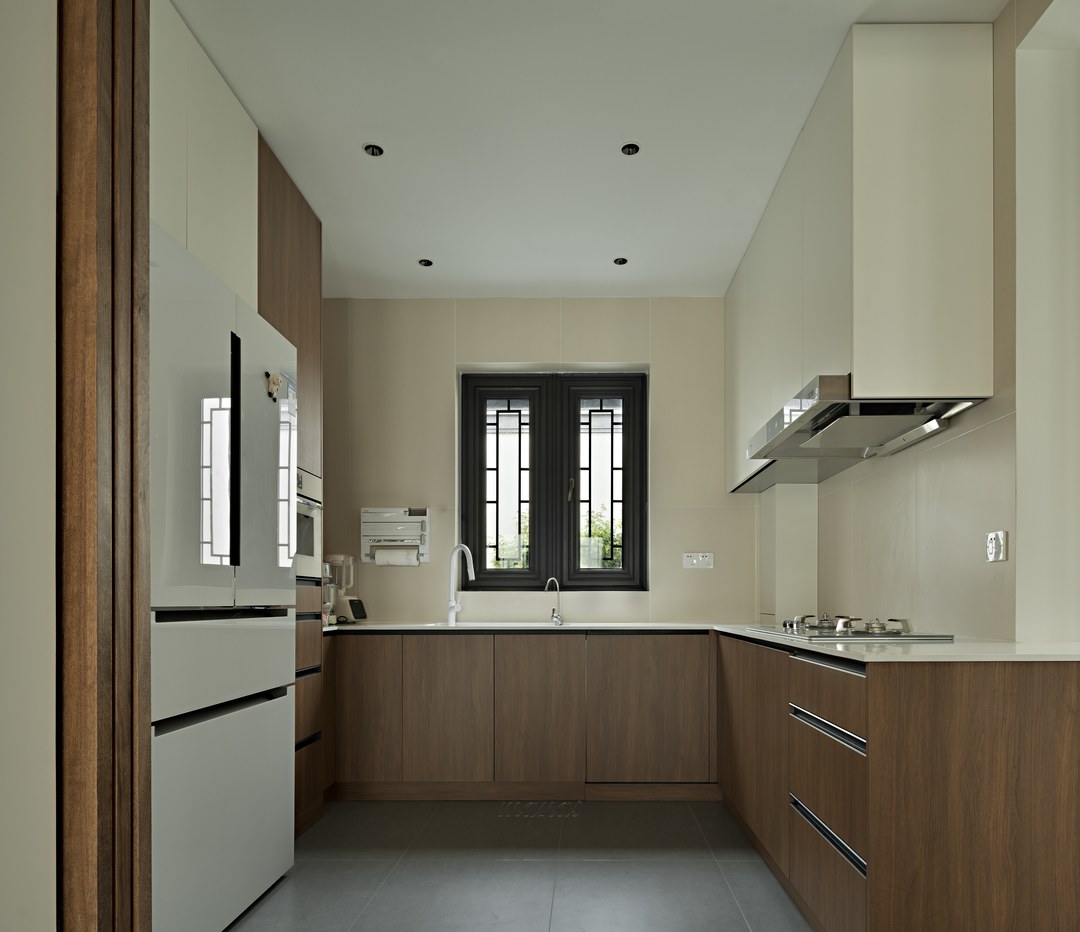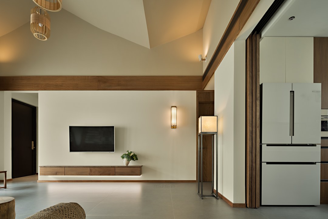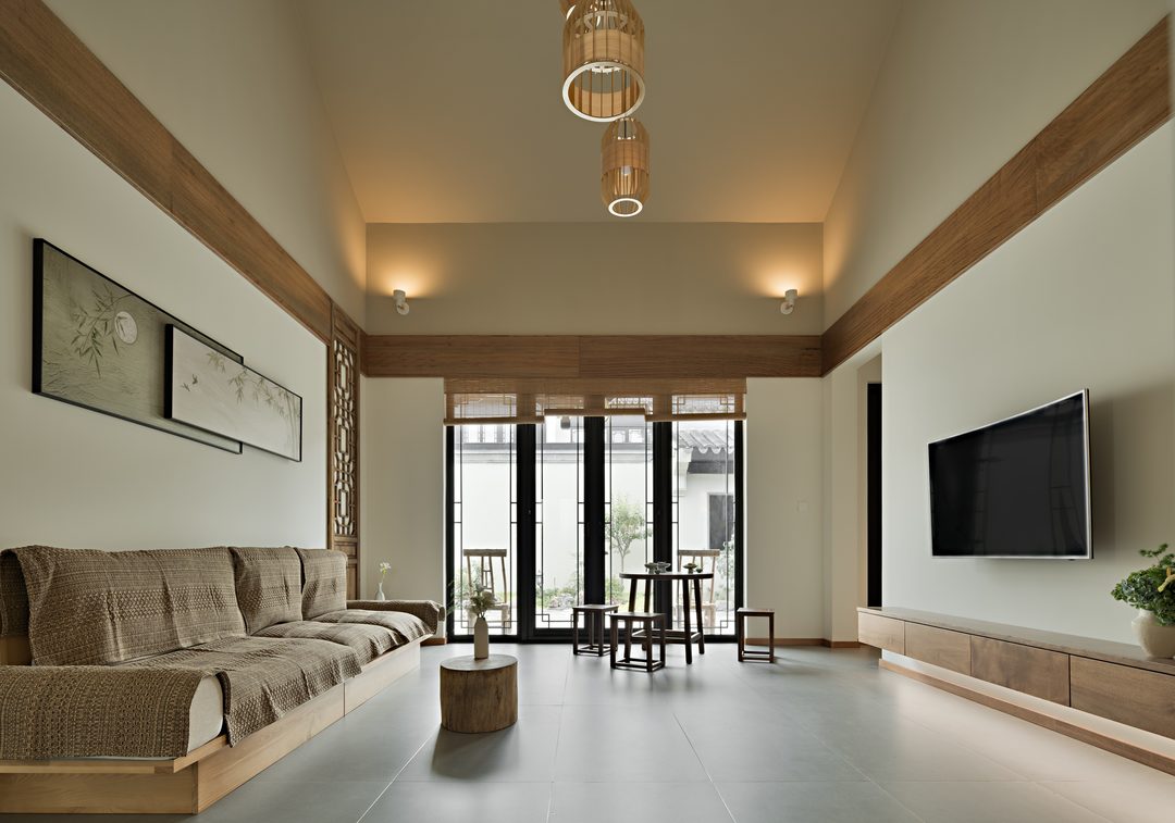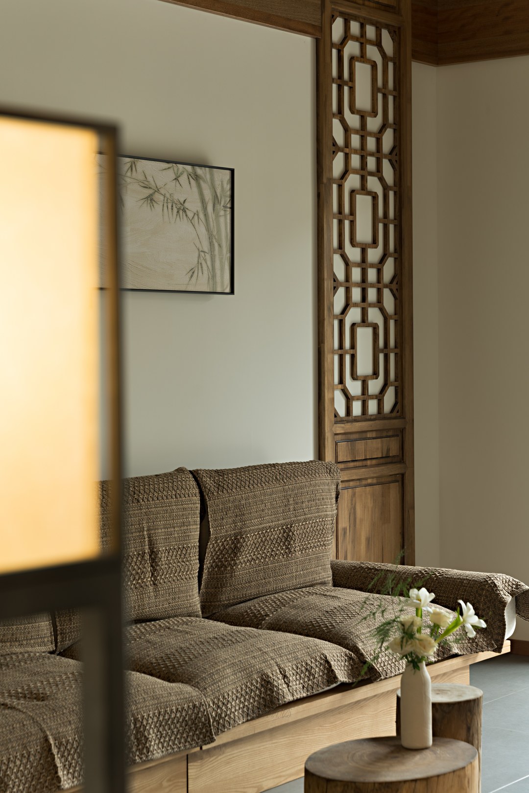 合院户型分前院后院,客厅所在位置位于中院,客厅部位做了端井,寓意绿芜墙绕青苔院,中庭日淡芭蕉卷。是业主对家具氛围与环境的期待。
