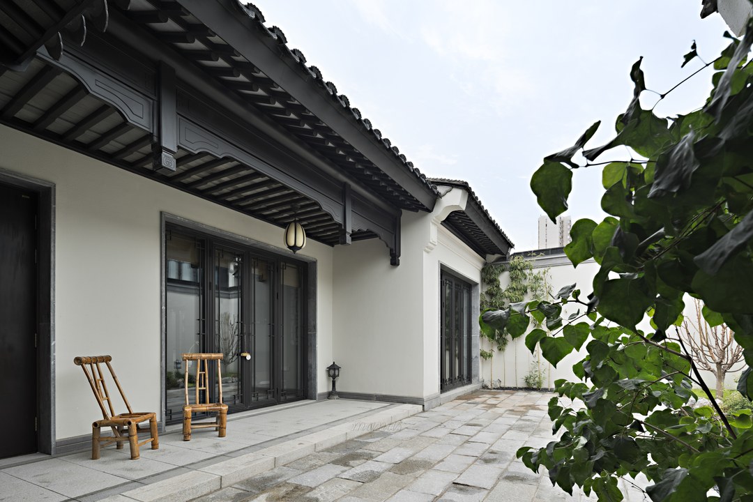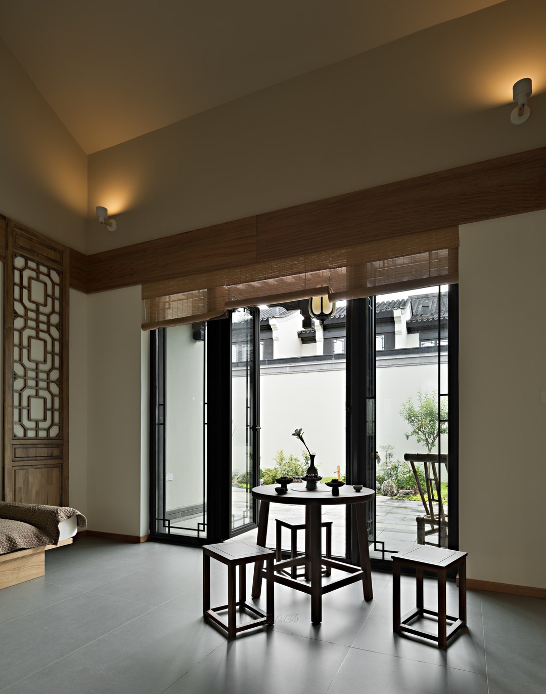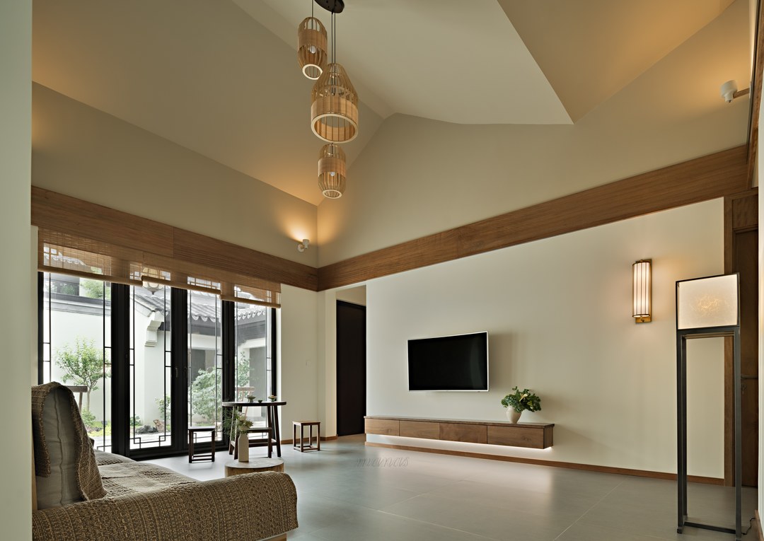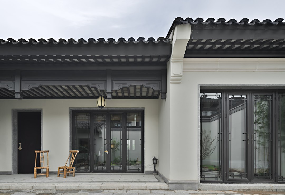 由于合院建筑属徽派建筑风格,屋顶没有经过任何改造,屋内呈尖顶样式,保留了徽派飞檐特色,从外观上来看,飞檐似鸟儿一样展翅飞翔,仿佛充满了蓬勃的生命力,让庞大沉重的白墙黑瓦充满灵气,也让动与静巧妙地结合。
