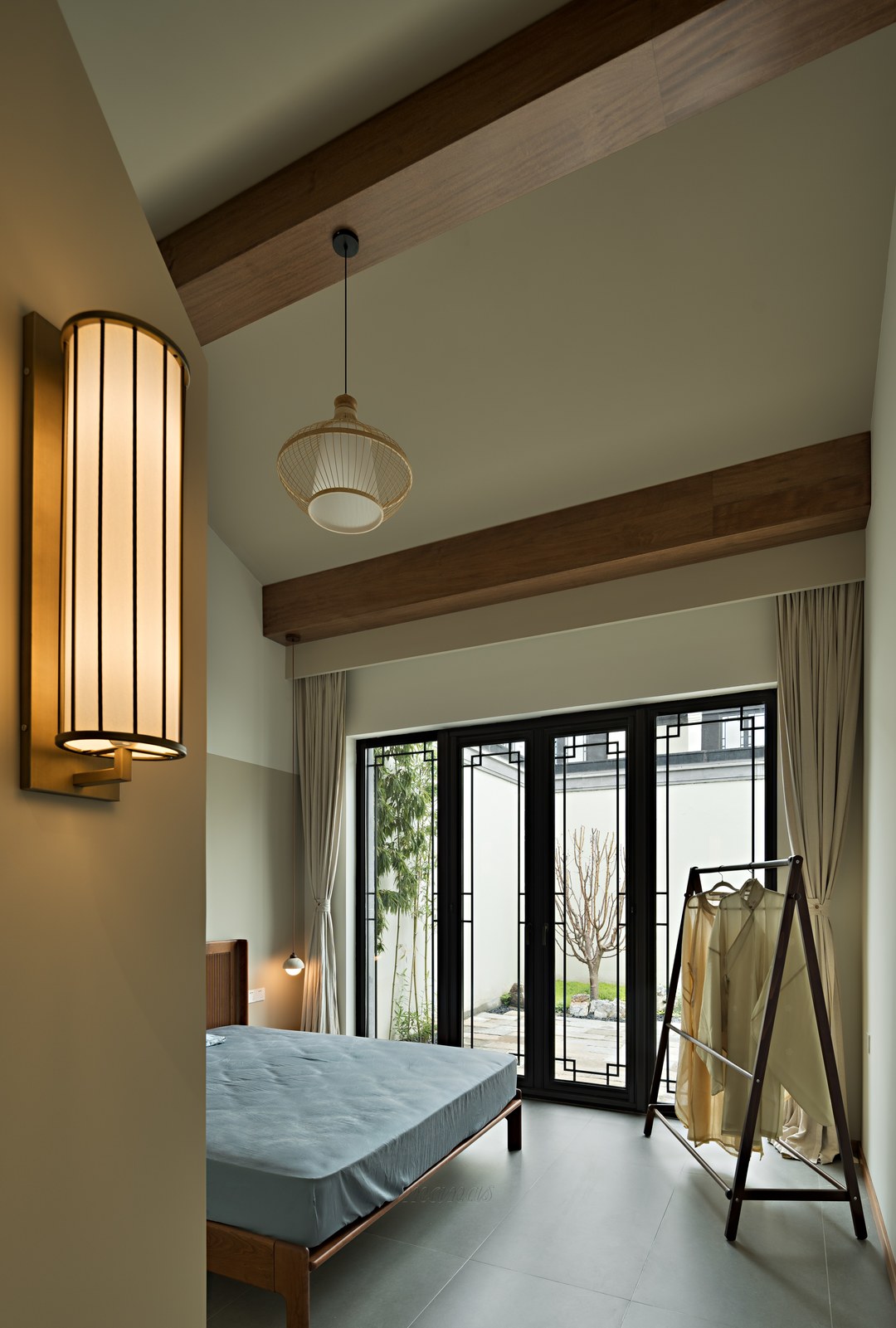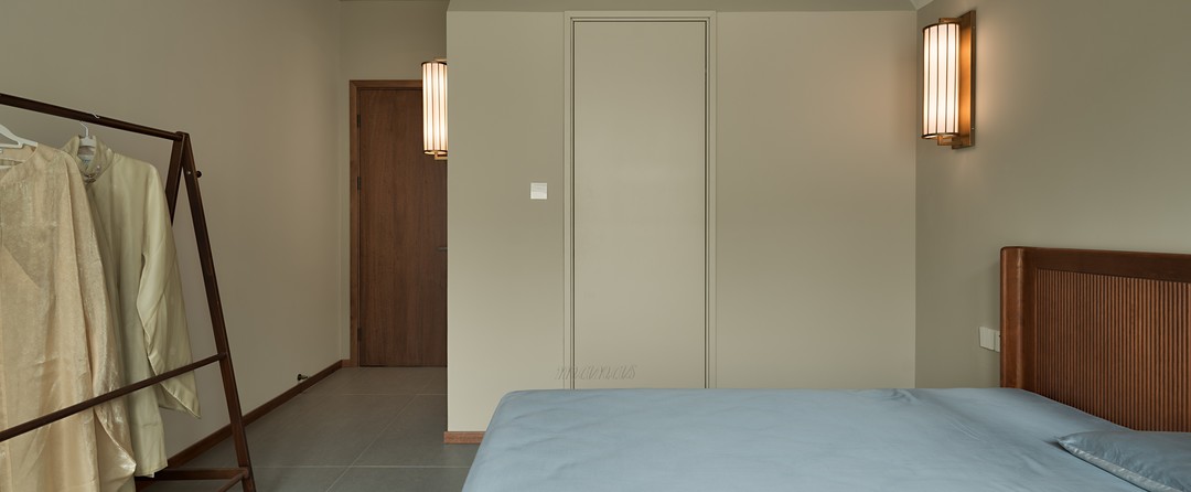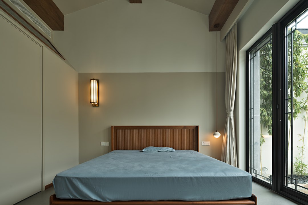 主卧的亮点是衣帽间,因为建筑尖顶的特殊性,衣帽间沿着屋脊原有结构进行重构,让平静舒缓的休息区增加了一点趣味性。