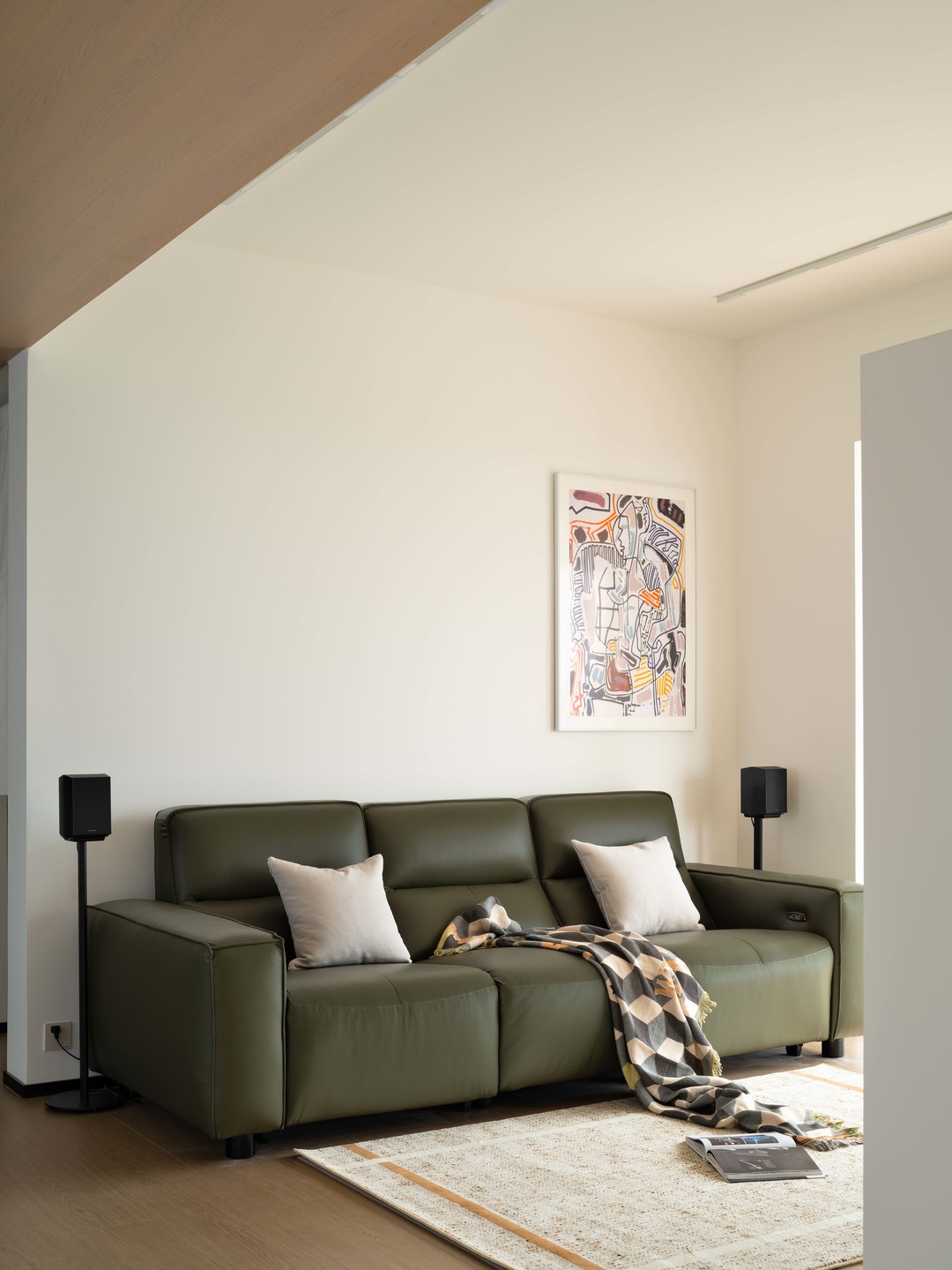原木风如果仅仅使用单一配色很容易设计得“过于廉价”,所以在配色中增加了一些冷色绿色来作为调剂,墨绿色的沙发和针织毛毯就是配色中的一环。