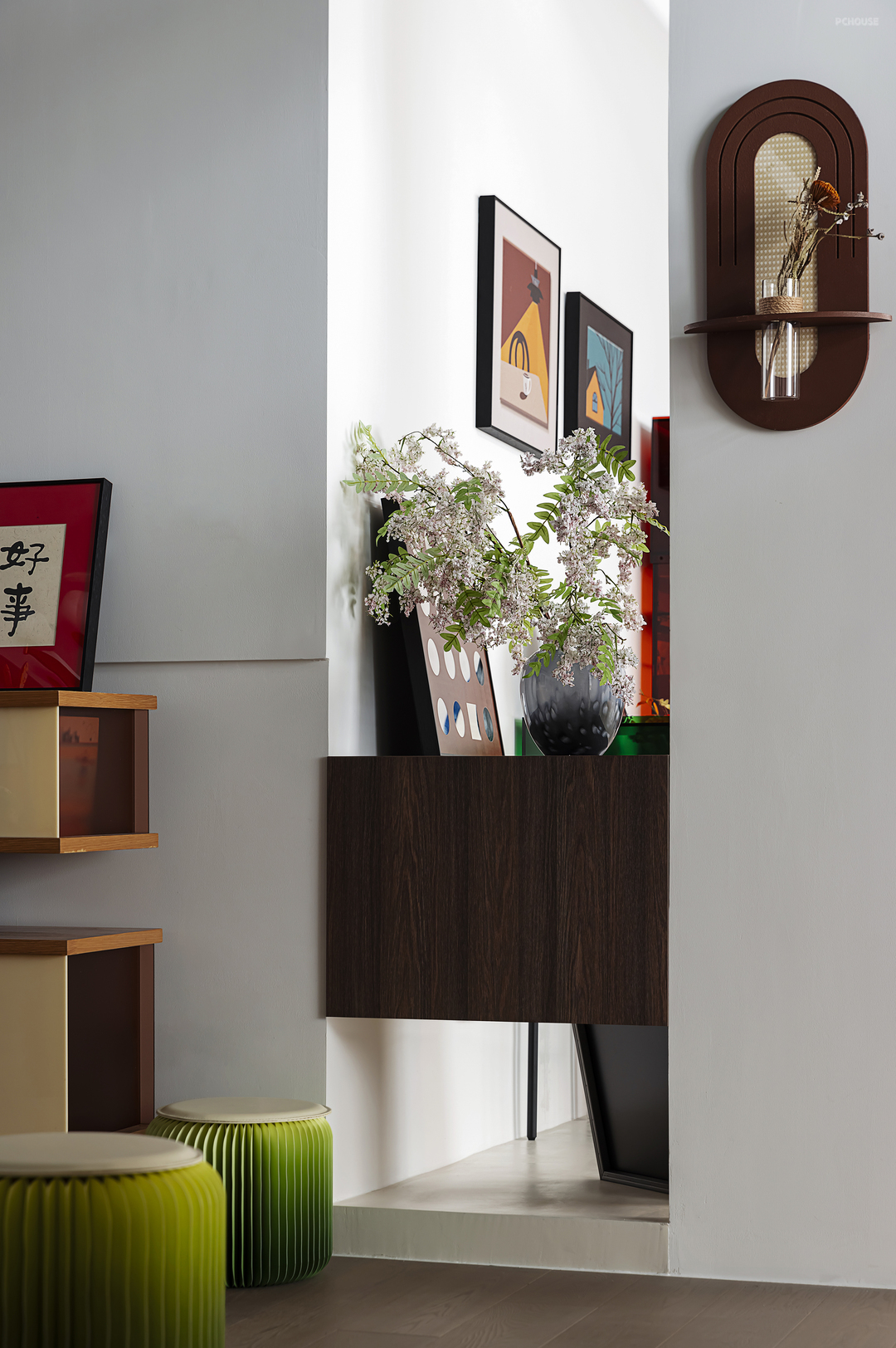 深色木架散发温润气息,牵引着空间的纯净质感,摆件材质的穿插尽显细节处理,将空间角落打造的趣味十足。
