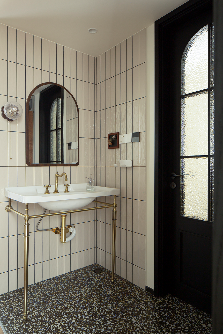 公共卫生间打破常规布局,将洗手台区域独立于过道旁,以半开放式设计增强空间互动,此处也并未设计传统储物柜,而是借助做旧五金与中古壁灯,共同构建出一个精致而统一的复古场景。
