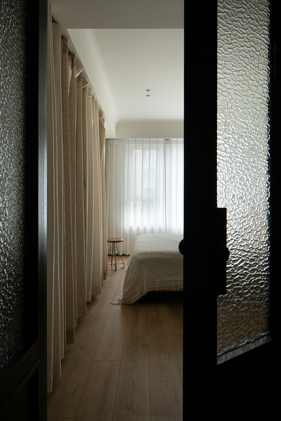 在收纳方面,我们延续了公共区域的自由逻辑,未设置传统衣柜,而是以半开放式组合系统替代。吊顶内预埋滑轨,搭配可开合的布质拉帘作为遮挡。这一设计不仅灵活实用,织物的柔和质感也进一步消解了空间的生硬感。