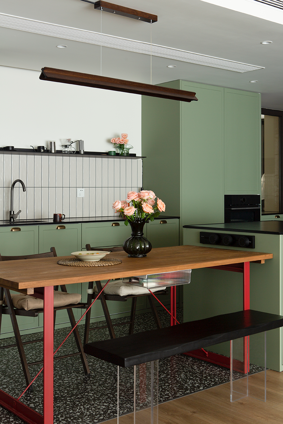 餐厨空间的材质搭配,充分回应了业主的审美偏好。他们钟爱绿色,并对木质及自然质感有着天然的亲近感。因此,我们在整体收纳系统的柜体上使用了复古绿,这一色彩决策不仅营造出惊艳的视觉焦点,也与墙面小白砖、水磨石地面共同构建出复古耐看的基调。