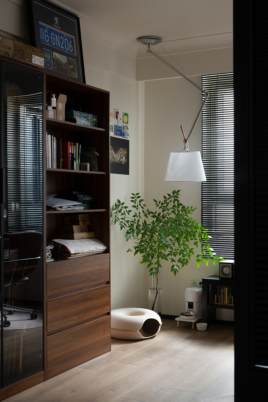 客厅与书房之间以黑色木百叶进行区隔,既明晰了空间边界,又保留了视觉上的半开放关系。我们摈弃了传统的门扇形式,转而通过材质的调性来调控空间之间的关系。