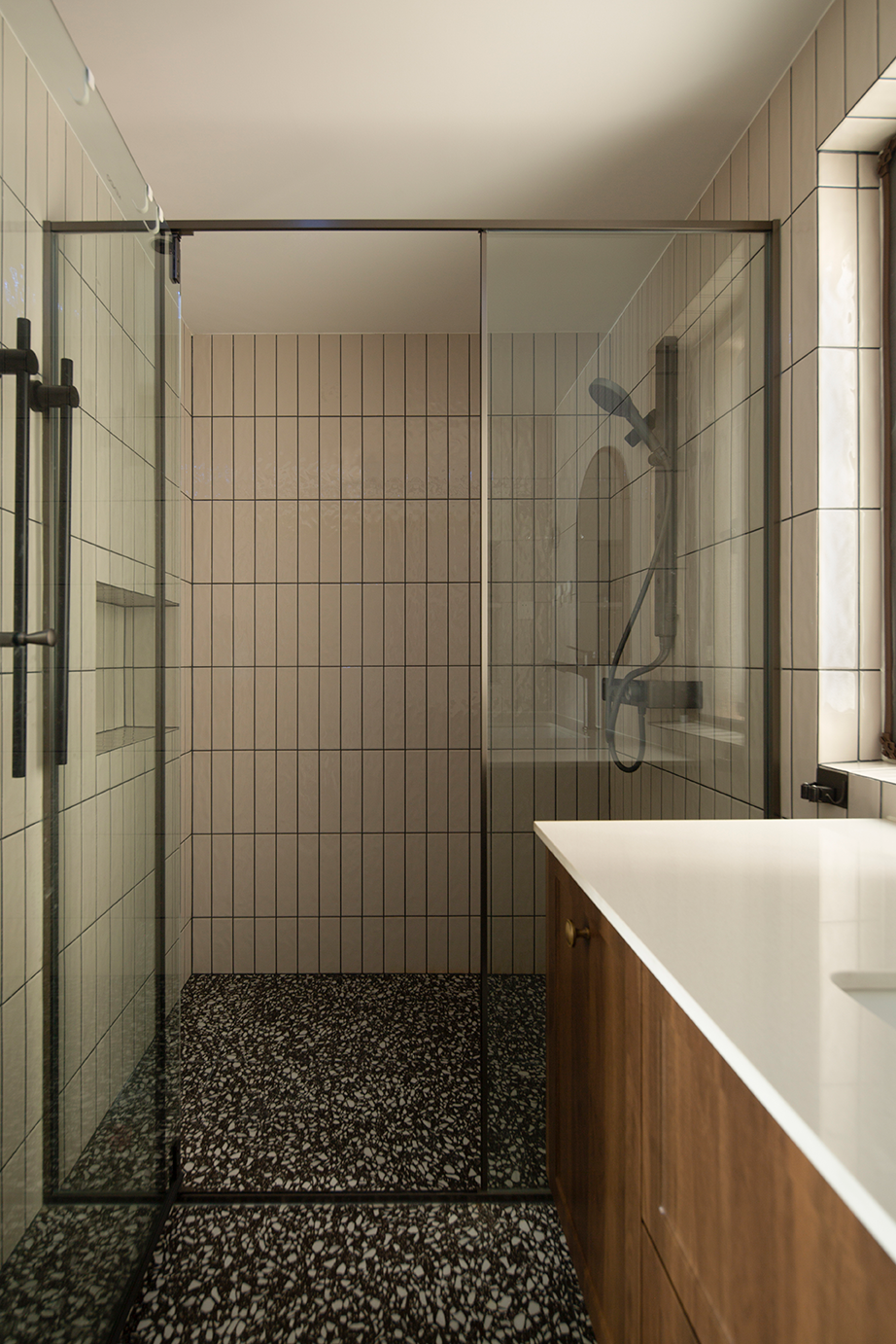 我们选用了做旧金属、水纹玻璃、小白砖与水磨石等富有质感的材料,通过精准的组合与细节把控,让这个小空间既贴合业主生活习惯,又能在视觉与情绪上赋予足够的感染力。