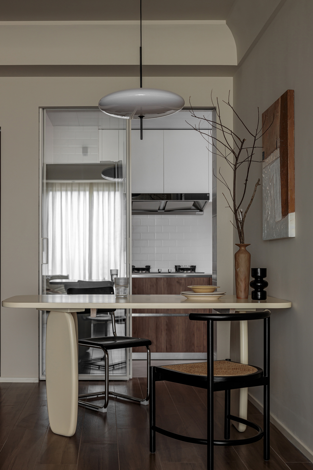 基于一人居的居住需求,设计厨房与餐厅连接,餐桌衔接墙面摆放的布局,预留空间给客厅区域,搭配中古餐椅、艺术感挂画,适配餐厨区实用性特点的同时,也与空间整体色调统一。