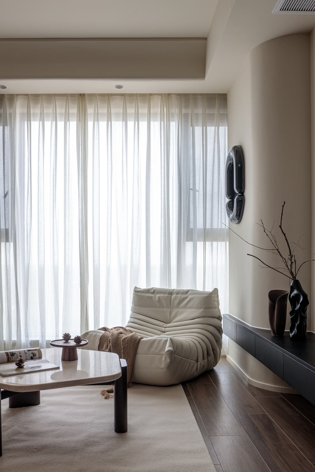 电视墙左侧摆放单人位沙发,连接造型墙、定制柜、茶几,满足居家时的不同状态。