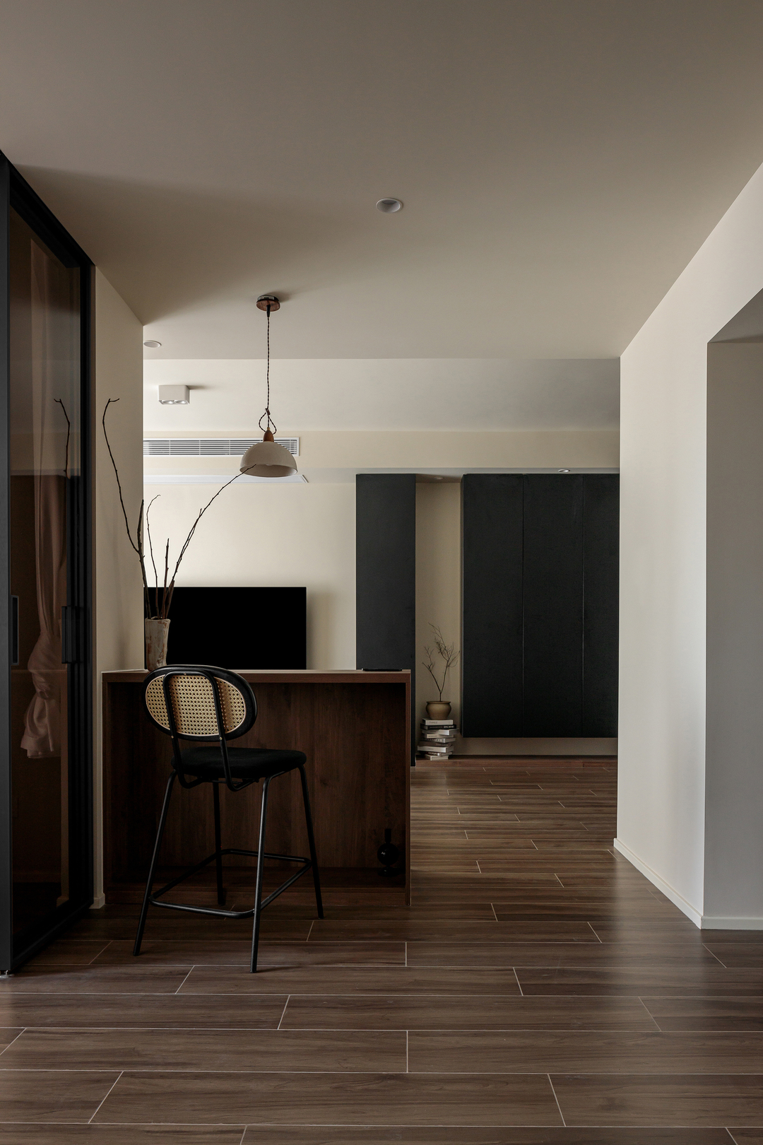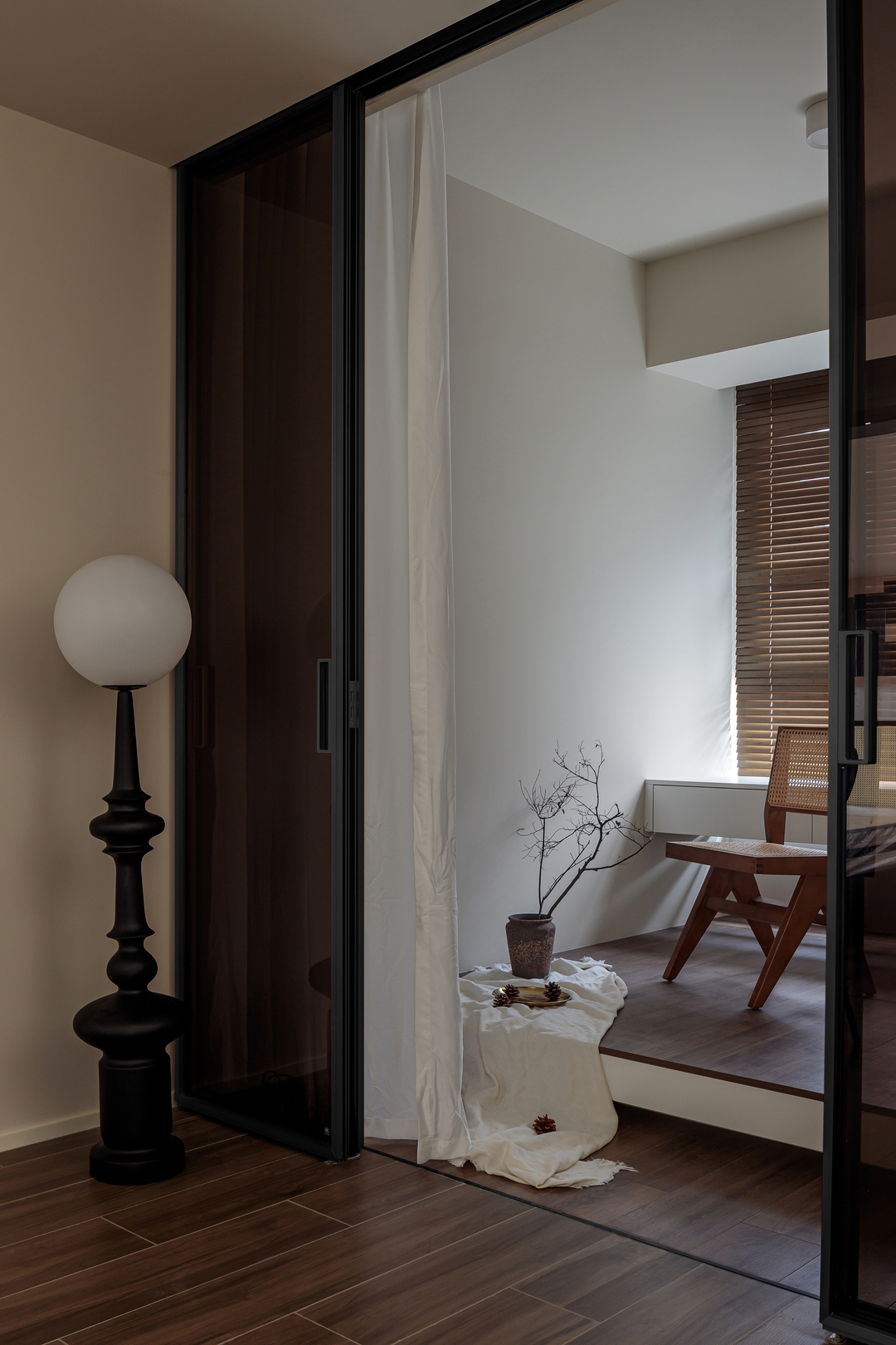 优化次卧的布局动线,改为开放式书房+功能房结合,玻璃移门做灵活隔断。走廊区域与该区域设计台阶式连接,视觉增加层次感的同时,借用百叶窗引入自然光线。