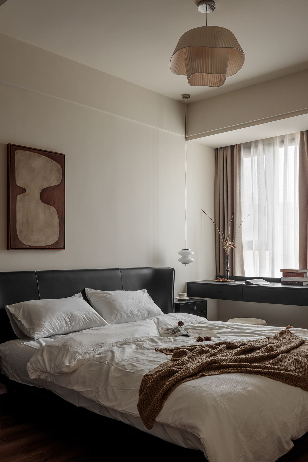 卧室延续奶咖色的色彩基调,搭配深色木质柜,选择布+纱的窗帘,避免采光过曝的同时,引入柔和的自然光。