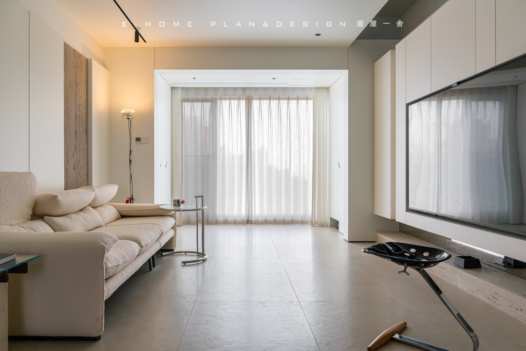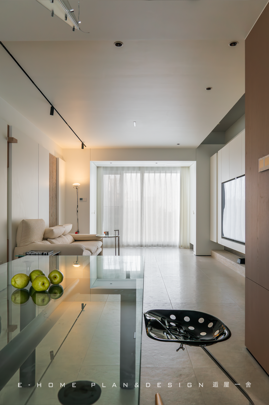 是可以闲庭信步的游荡氛围,客餐厅一深一浅左右开弓,铺设出清晰的开阔布局,我们会被大面积的采光吸引,原因一个来自于窗帘的二次过滤,另一个则是整面墙的白色储物系统;空间内不预设传统茶几,但依旧顾及随手拿取的生活习惯,节奏明快大步地跳跃,只在使用细节处转折留空。