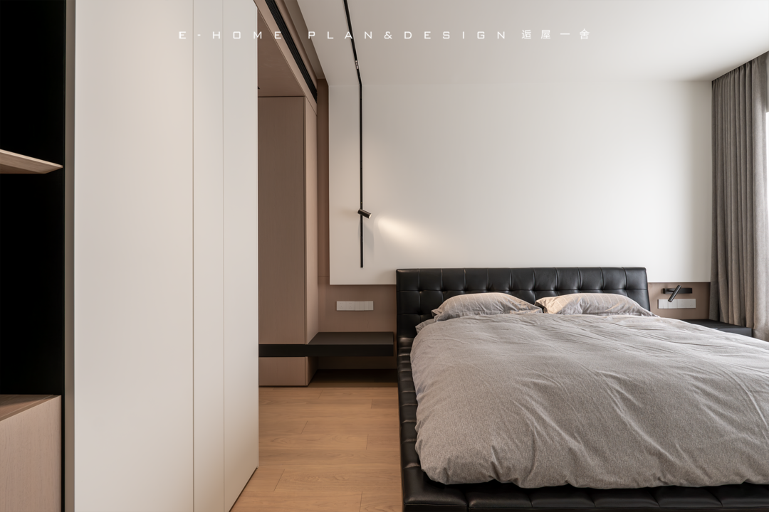 在材质与色系的递进中完成功能分区。板材的接缝处理精细,让柜体本身成为墙面造型的一部分,海量收纳需求被满足,又丝毫不显笨重与“仓库感”。而这里的灯光绝非一盏主灯了事,嵌入天花的基础照明提供均匀光线,床头的壁灯承担阅读与起夜的重点照明。这种组合允许屋主根据心情和需求切换光影模式,是借鉴酒店般放松氛围的技巧。