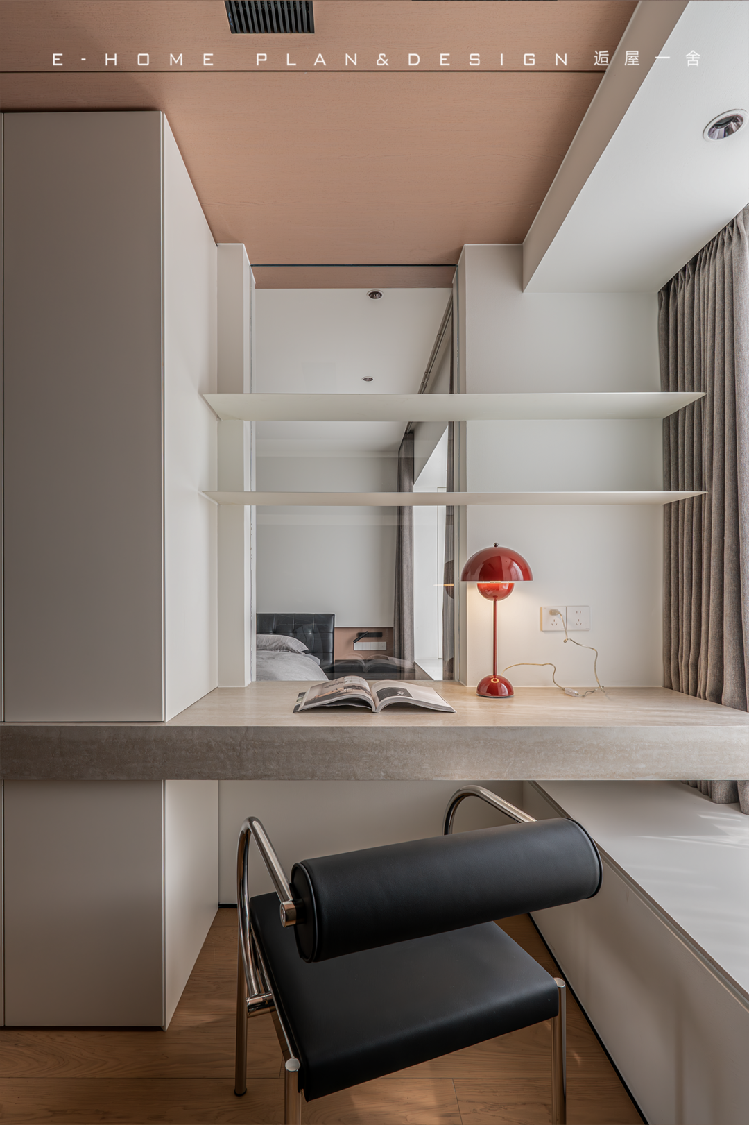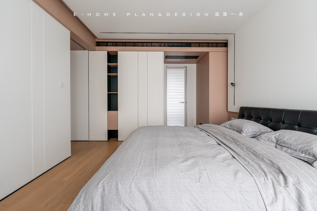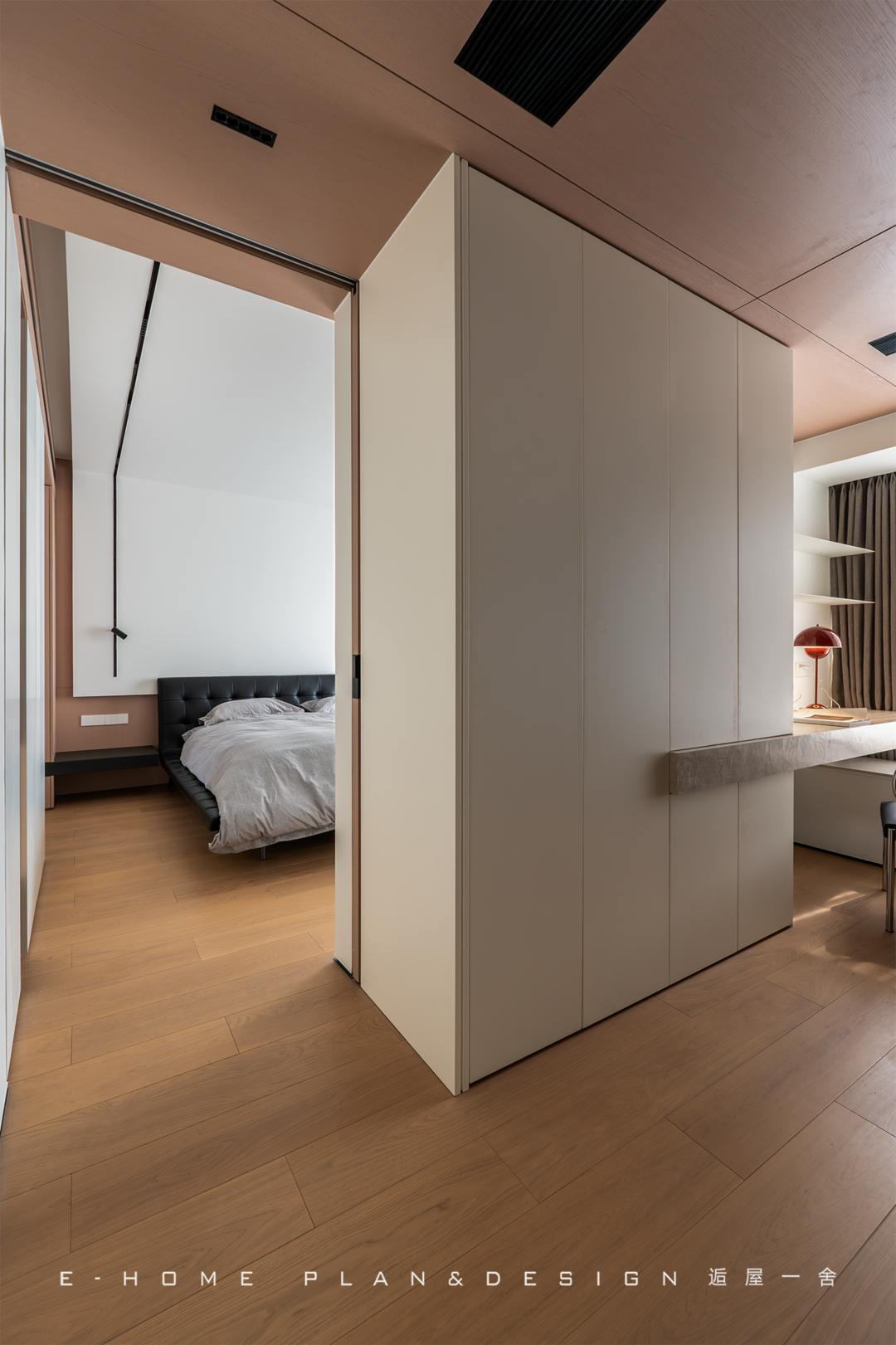 和休憩区域仅一个柜子之隔,故事就完全不同,木地板在蔓延的过程中,逐渐变换为和茱萸色的木饰面相接,从地面到顶面,折弯上去的延伸设计让休憩区域有着温暖而整体的包裹感。视觉上只留下干净的块面与利落的线条,衣帽收纳系统通过柜体的组合与转折,形成一个环抱睡眠区的流畅储藏区域。