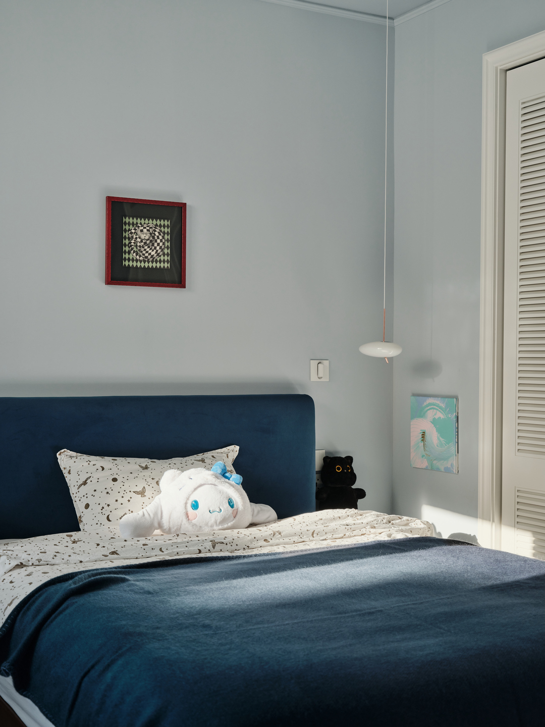以柔和浅蓝铺就空间基底,深邃的蓝色磁性黑板漆顺势成为视觉重心,一深一浅形成色彩交响。可擦写表面承载童趣涂鸦,磁吸功能让作品随时更新,墙面成为会生长的创意画布。从涂鸦到安睡,空间以灵活姿态陪伴成长每一步。