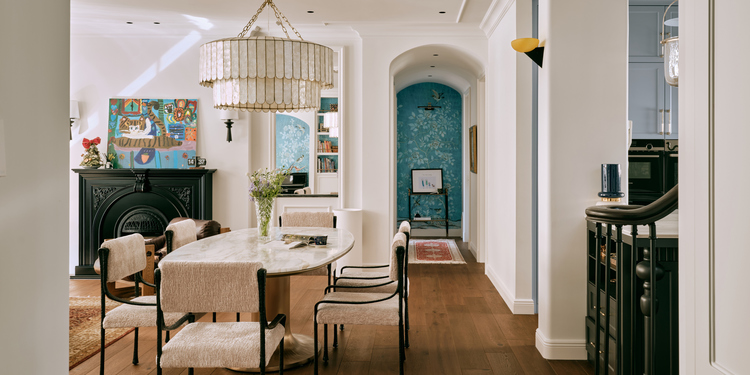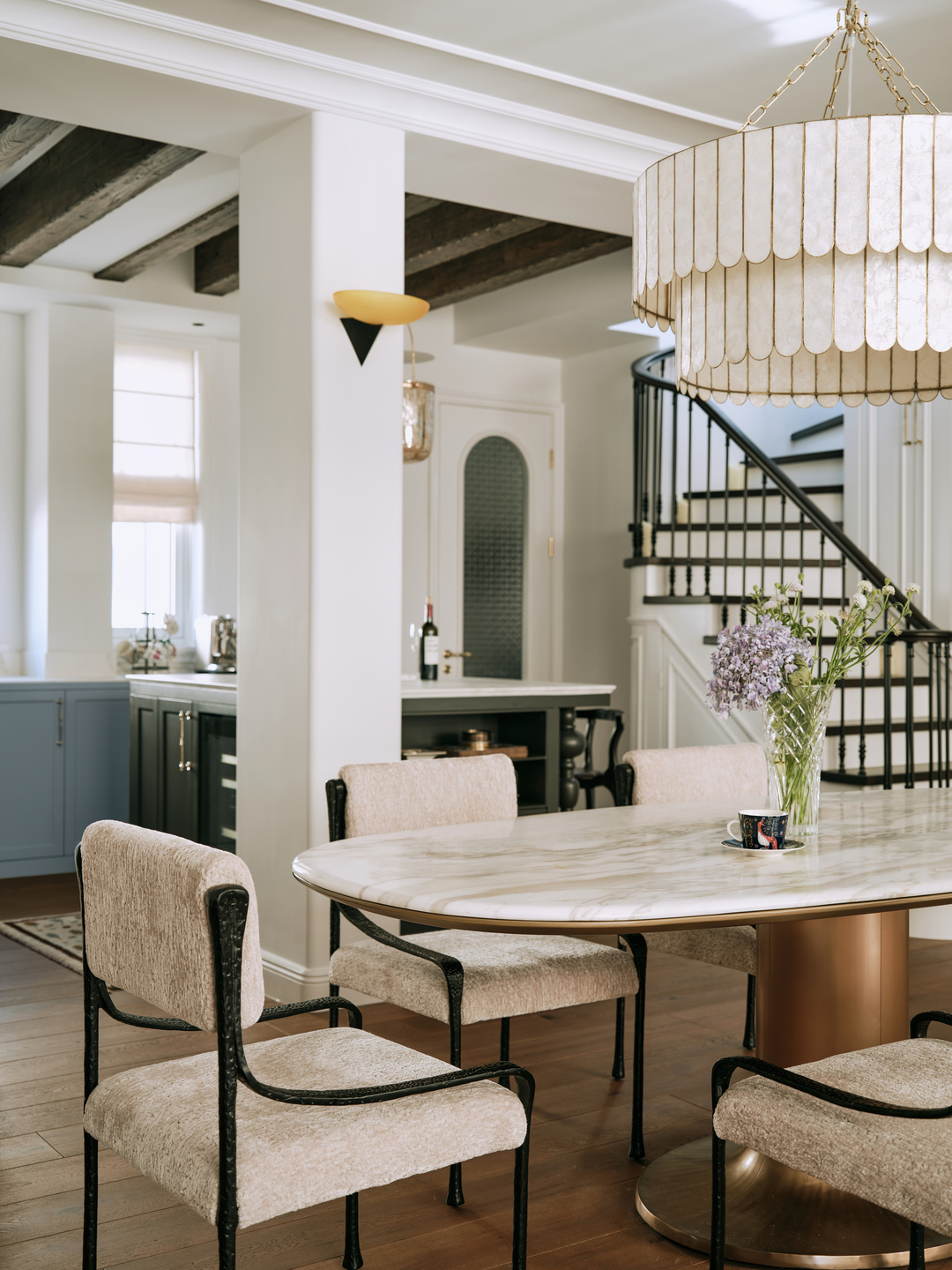 客餐厅之间未设隔断,老钢窗引入的光影在地面流淌,将用餐区的大理石餐桌与客厅的柚木箱茶几串联成整体,视线可穿透至厨房,让自然风成为空间的流动媒介。