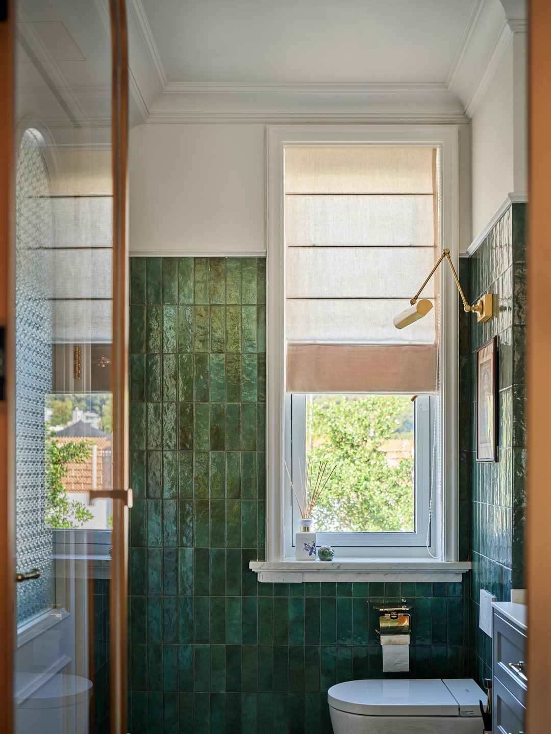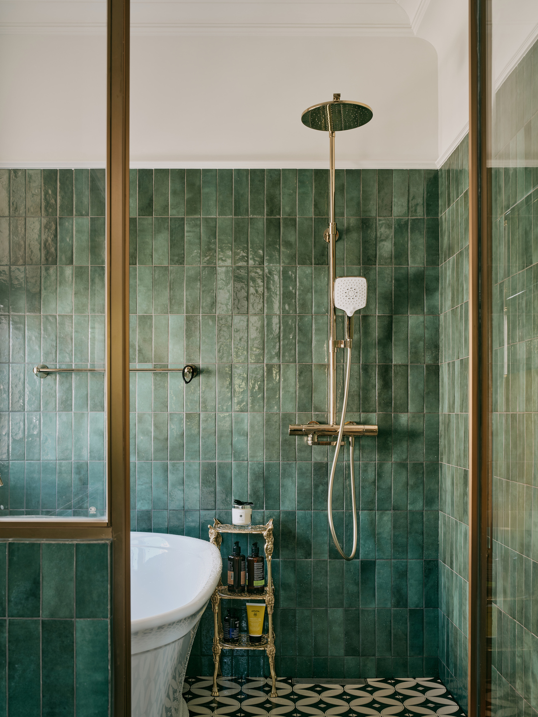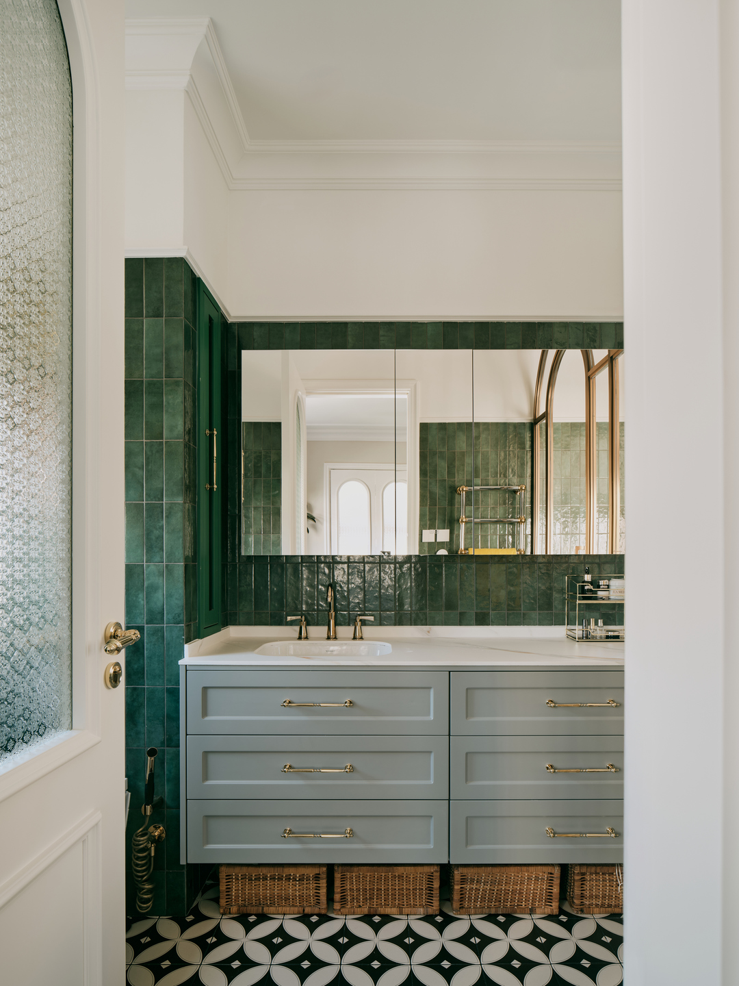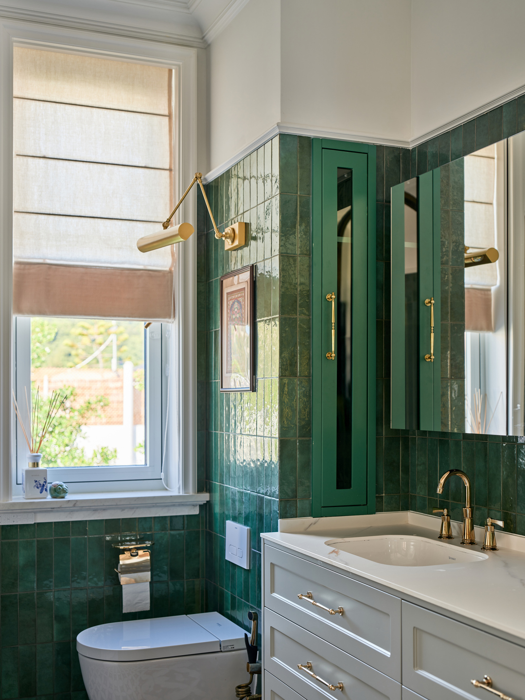 进入主卫,墨绿砖墙如深海般涌入视线,金色拱门以半圆弧度破开深邃,冷暖碰撞。几何地砖的理性线条与拱门的曲线张力达成微妙平衡,编织箱的质朴肌理则柔化了金属的冷冽感。自然光穿过拱形框架,在手工砖的釉面上游走,将奢华质感与自然意趣编织成浴室的叙事诗。